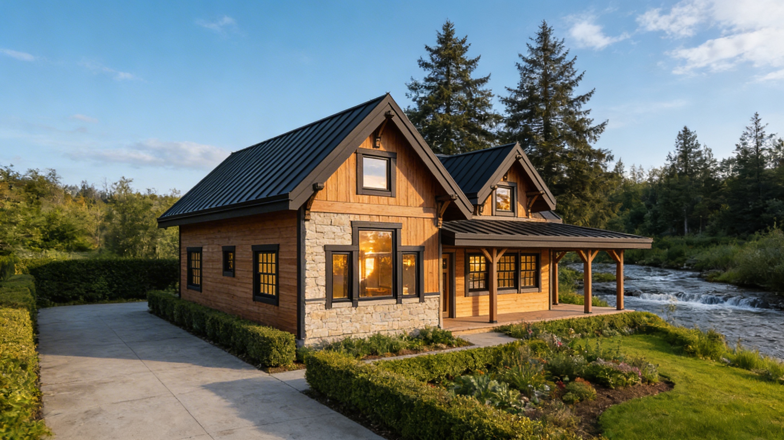 clean rustic cabin architectural exterior home rendered in cinematic vibrant daytime lighting with blue skies and sparse clouds in the sky warm glow and reflections off of the windows select grade wood cedar siding green manicured landscape around structure with hedges and gardens and patches of grass black standing seam metal roof prominent cinematic small river with small rapids and big fir trees behind the house in the background high fidelity photorealistic visualization crisp shadow falloff refined facade geometry soft atmospheric depth premium architectural photography mood ultra clean composition and materials dark trim around windows