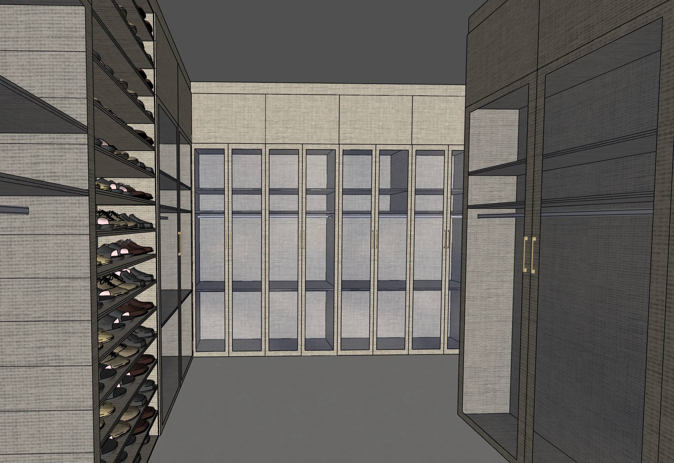 render a luxurious walk in closet featuring sleek modern cabinetry with a light beige finish incorporate glass doors with subtle reflections creating a sense of openness use warm ambient lighting to evoke a cozy and inviting atmosphere the floor should be a smooth matte ivory tile add brass handles for a touch of sophistication the overall vibe should be elegant and serene with a focus on luxury and organization