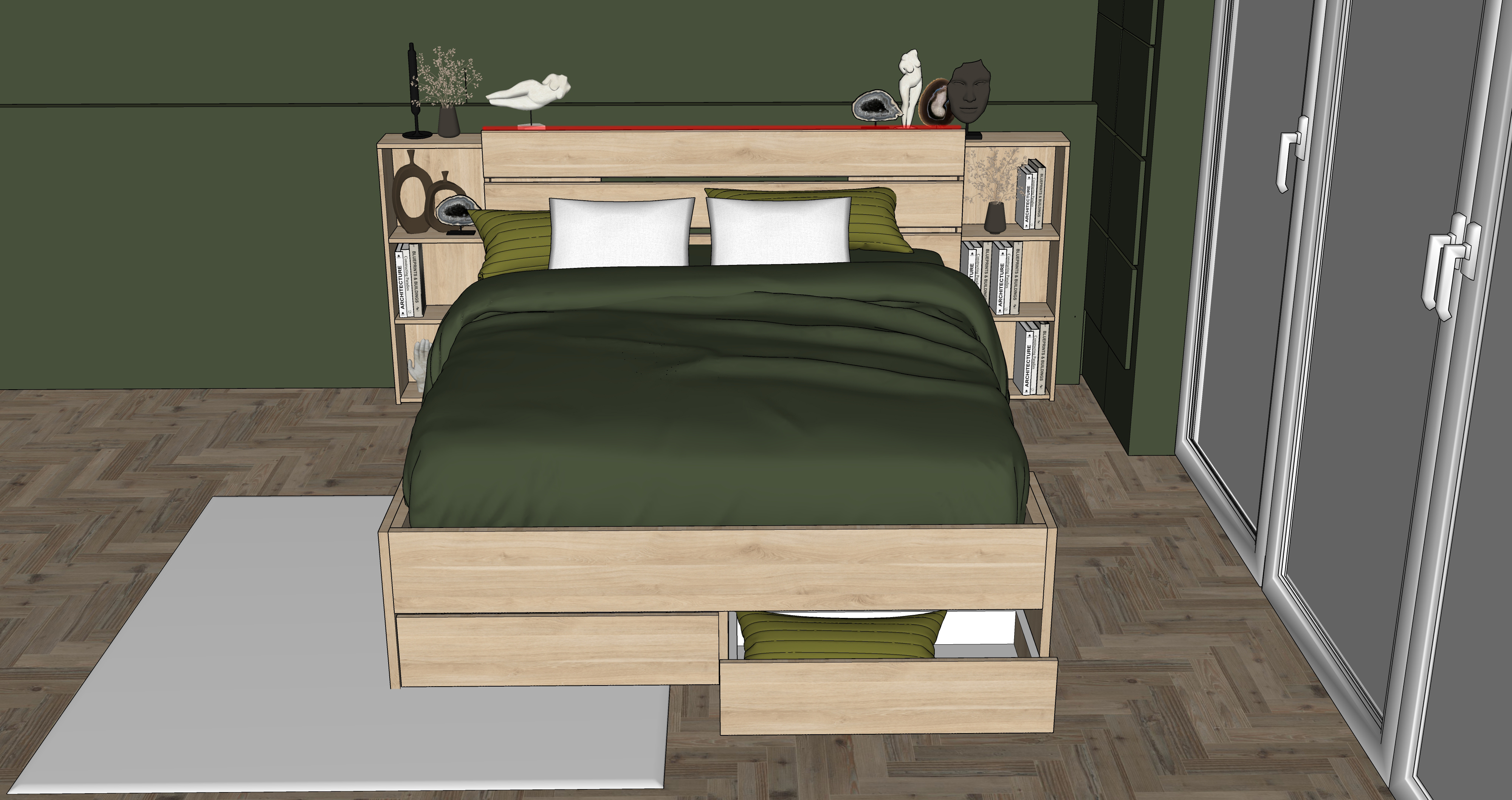 a serene bedroom with a warm and inviting atmosphere the bed features a dark olive green duvet and matching pillows paired with crisp white accent pillows the headboard and shelving unit are crafted from light oak wood books and decorative items in muted earth tones along with subtle beige and dark gray sculptures grace the shelves deep forest green walls create a cozy backdrop the parquet floor is a soft brown and a light gray rug adds softness to the scene natural light streams through large windows enhancing the peaceful ambiance