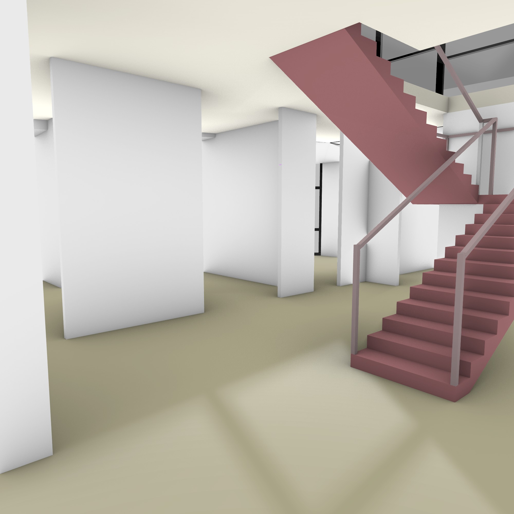 rchitectural watercolor rendering of a small contemporary research station lobby interior realistic depiction of a compact entry space with a red steel staircase leading up to a mezzanine level white plaster walls pale polished floor and soft natural daylight streaming through side glass openings simple minimal geometry emphasizing the red stair and clean lines subtle steel and glass detailing no wood cladding or skylights calm quiet atmosphere with scientific precision and warmth rendered with crisp architectural watercolor and pencil linework soft shadows and light washes fading into white paper edges artistic yet restrained showing clarity and intimacy instead of grandeur