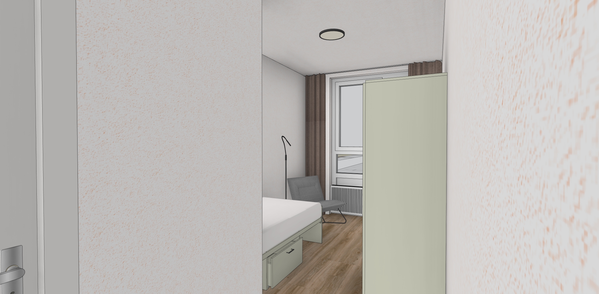 maintain all colors natural daylight outside small city skyline utrecht science park turn lights on big cabinet and bed ends are sage green from egger make as photorealistic as possible
