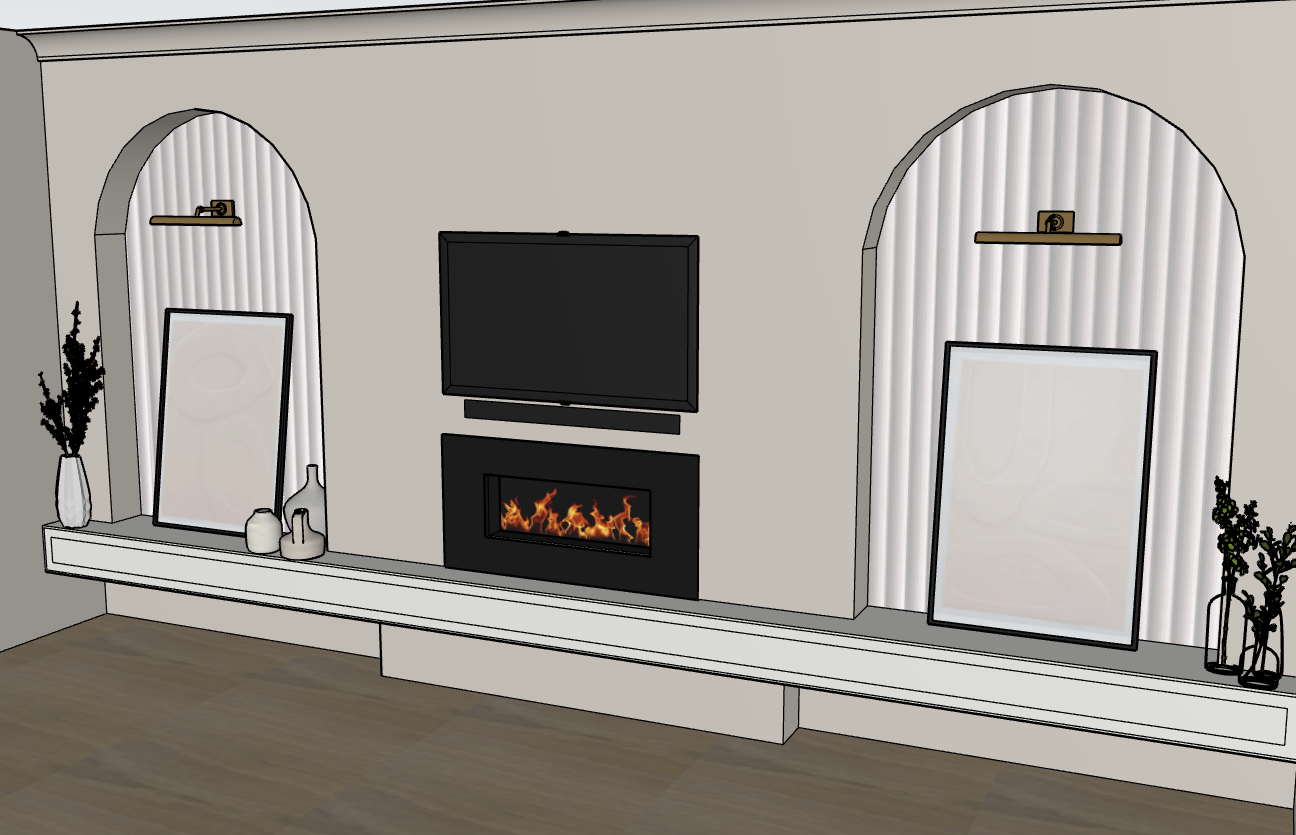 evening setting with picture lights on and led in arches and behind tv and the fire on