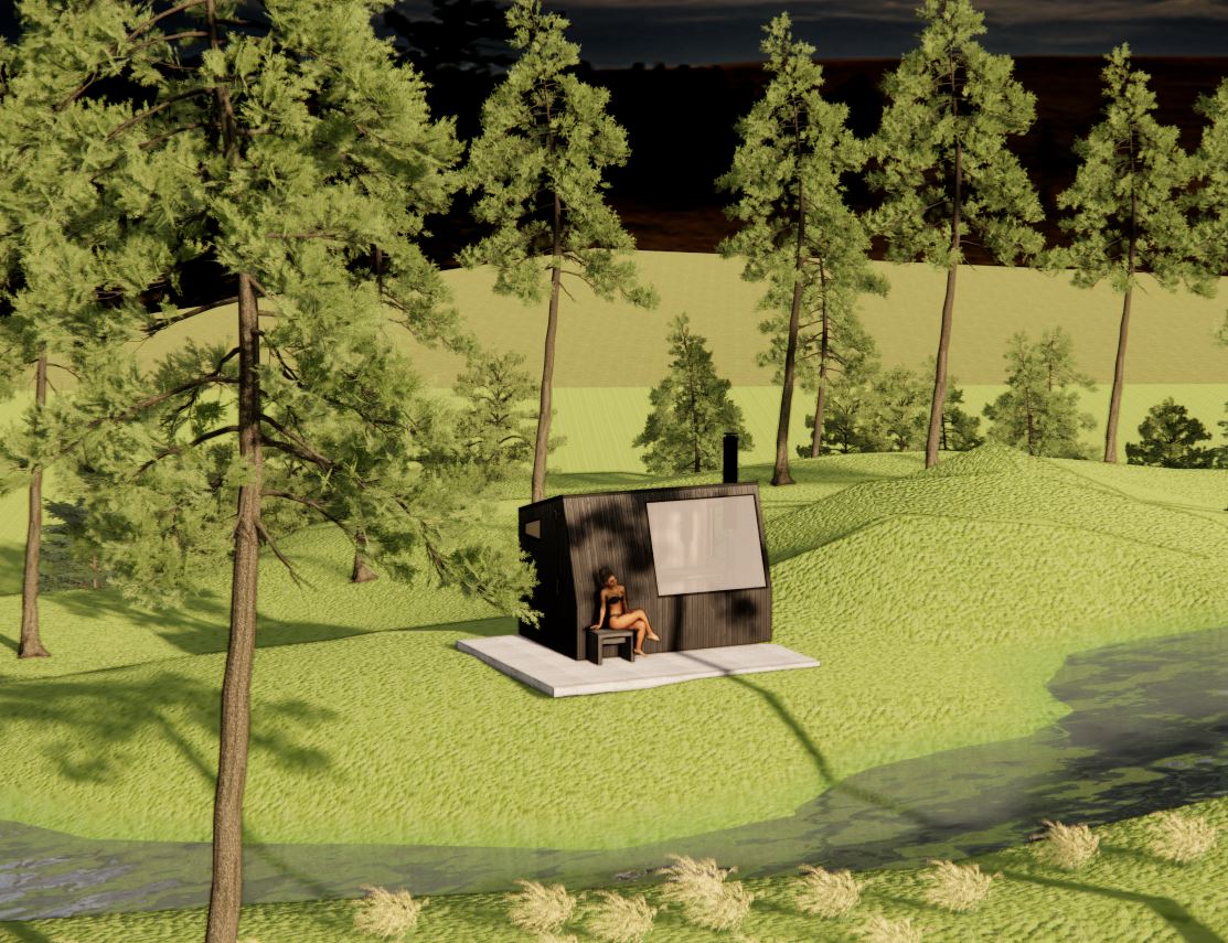 render a photorealistic 3d perspective of this house the current material style keep model geometry the same windows doors roof walls make a green meadow with moss gray several pine trees around looks native to swedsih forest do not change relief do not change the view only enhance the current materials and make the landscape nicer vegetation detailed textures in the wood siding and a vibrant clear sky with light atmospheric depth render in hyper realistic architectural visualization quality 8k resolution
