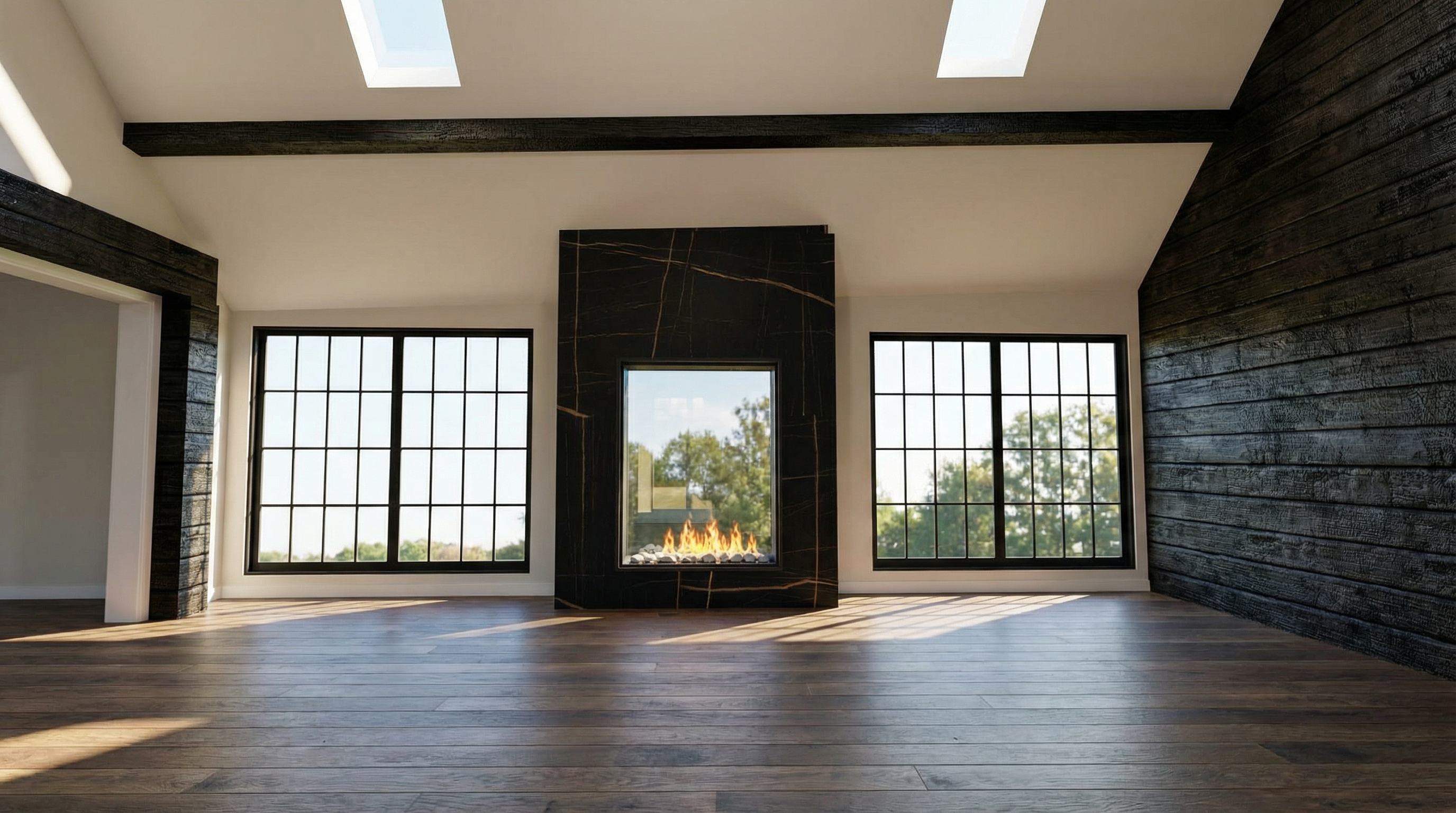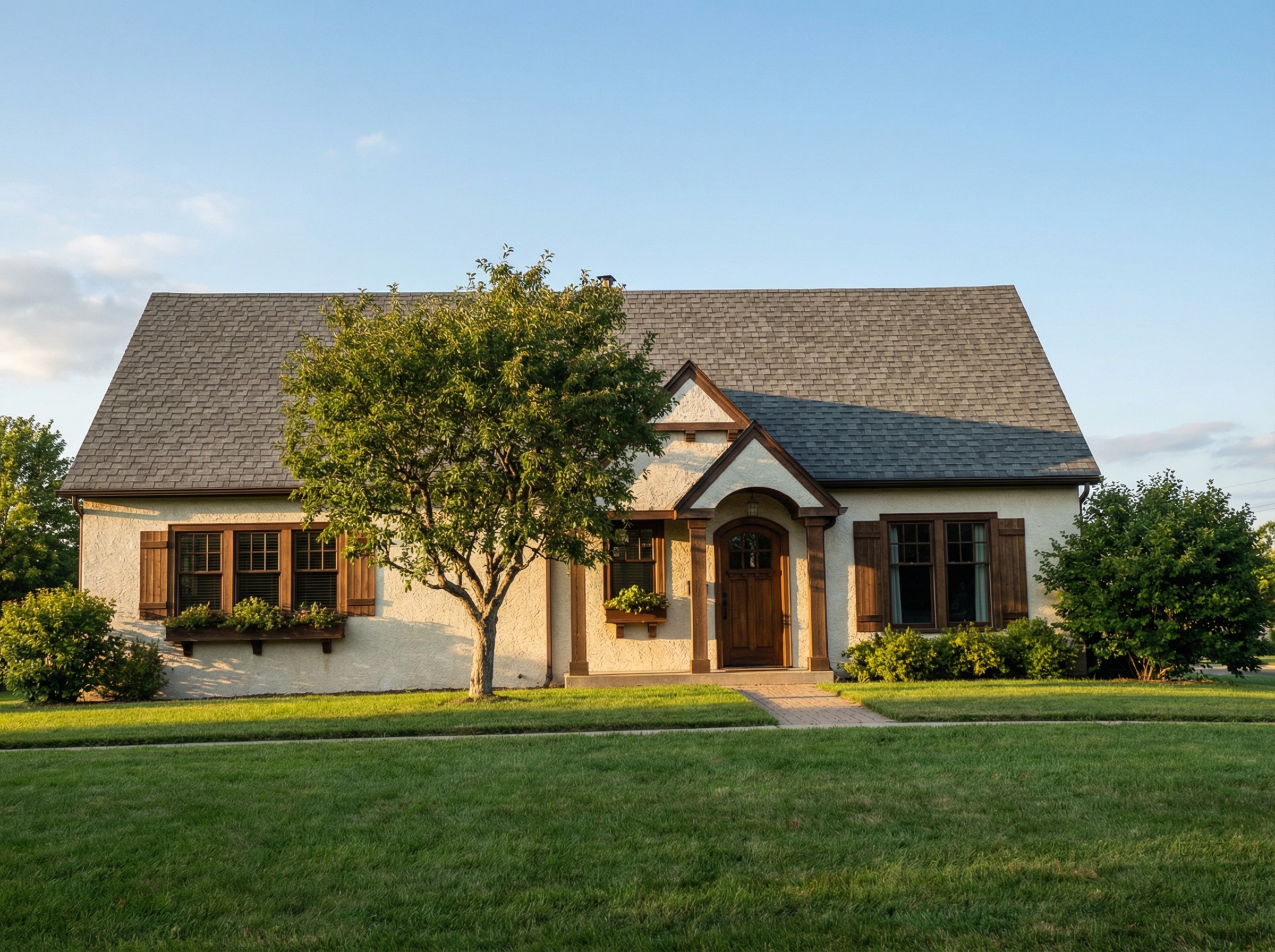 apply ranch architectural style to this sketch emphasize a long low slung horizontal profile that hugs the ground a deliberately one story composition that sprawls outward rather than upward use a low pitched roof with broad overhanging eaves and integrate an attached garage naturally into the facade materials should feel casual and unpretentious brick wood siding or stucco in earthy tones large windows and glass doors should blur the boundary between interior and exterior reflecting ranch s origins as a genuinely new american form designed for relaxed indoor outdoor living render in bright open daylight that celebrates the horizontal sweep of the composition