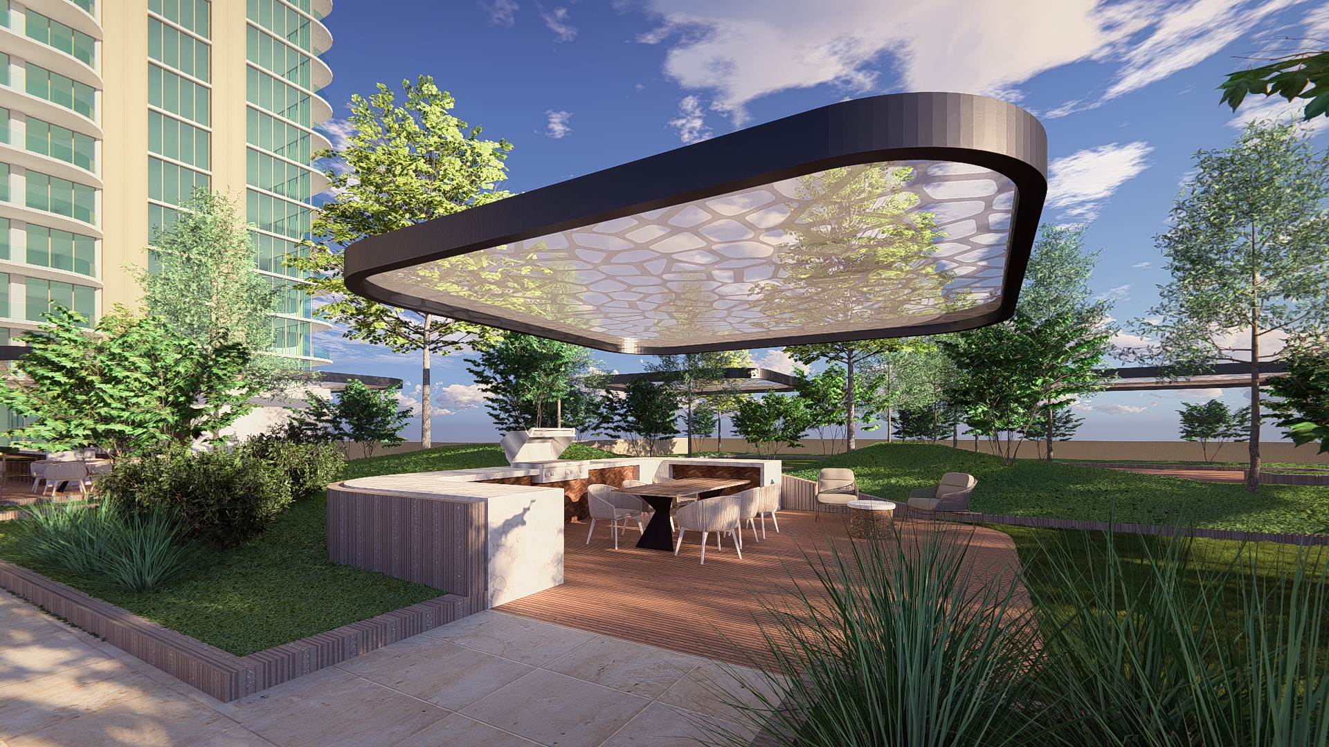 marketing rendering for luxury condominiums high end finishes with lush layered planting dramatic lighting