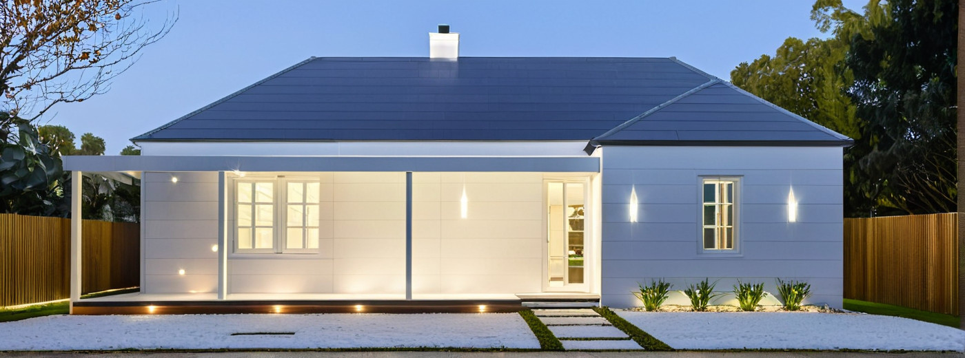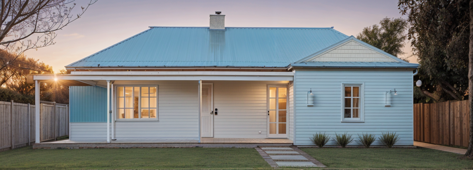 classical exterior shot in an australian rural setting at sunset with a lush green garden architecture