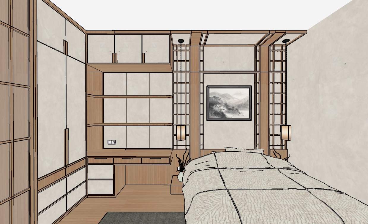 create an ultra realistic image from this jpg add ceiling spot lights use soft light wood textured to the floor and use warm off white for walls and the ceiling is white and add indirect light to the shelves add some decoration and add indirect light to the wood ceiling panel add soft outdoor light the wardrobe door using cream color