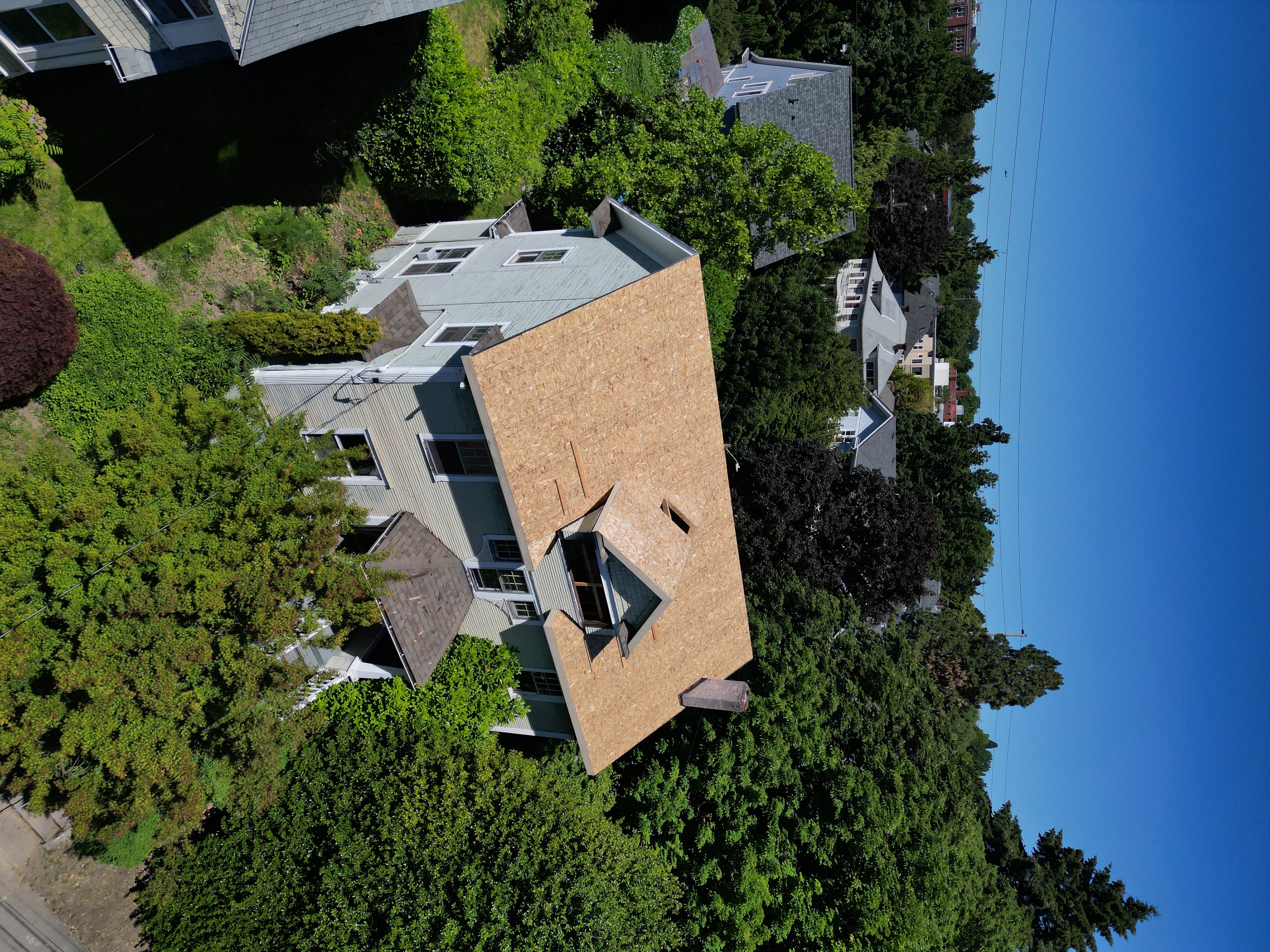finish this roof with architectural shingles restore siding to resemble 1940 colonial style siding white windows white trim clean up overgrown landscape and trees to open up the front porch stairs centered on porch light green siding paint clean up tree that is right up against the house on the right side of the porch