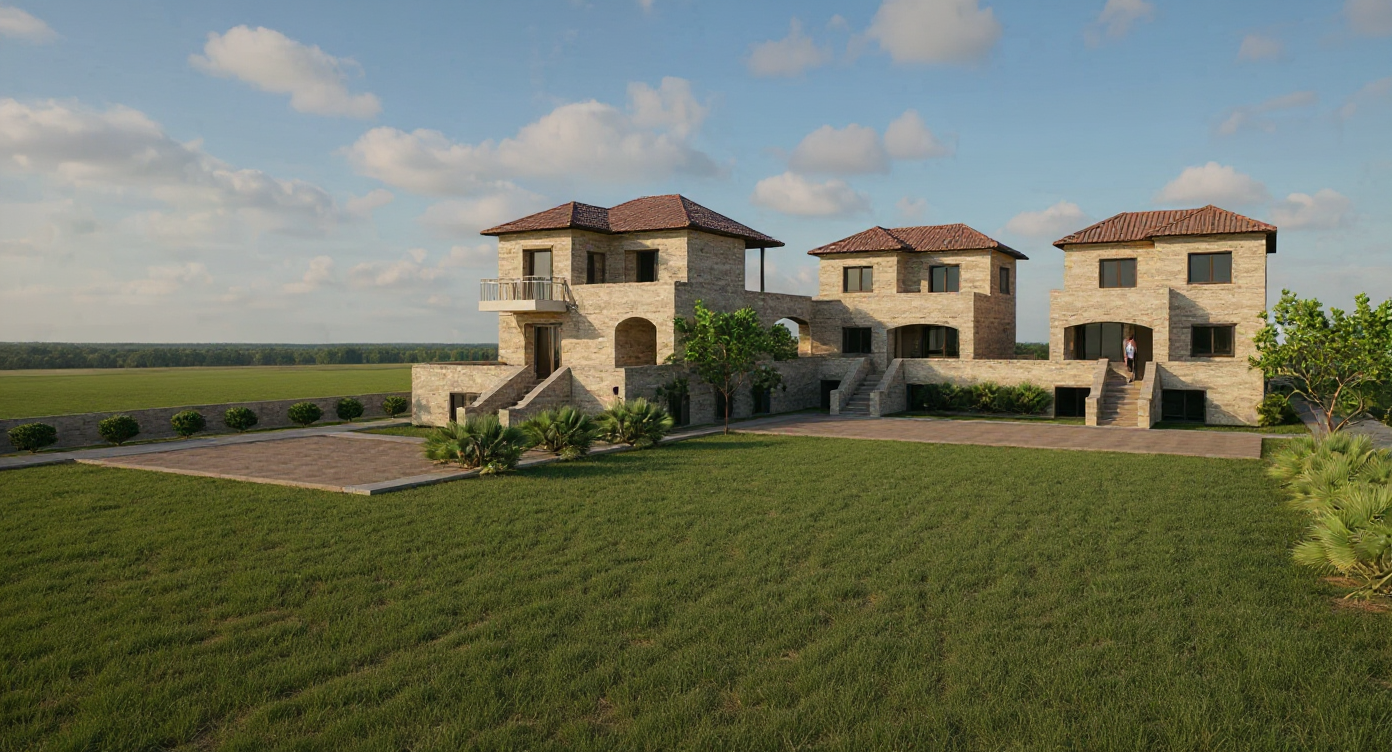 make the lighting more natural and realistic soft sunlight add some small bushes near the building morning time