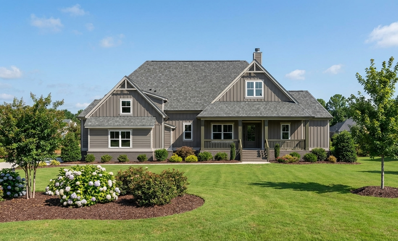add a 12 foot wide bed of pinestraw between these two houses and their front lawns