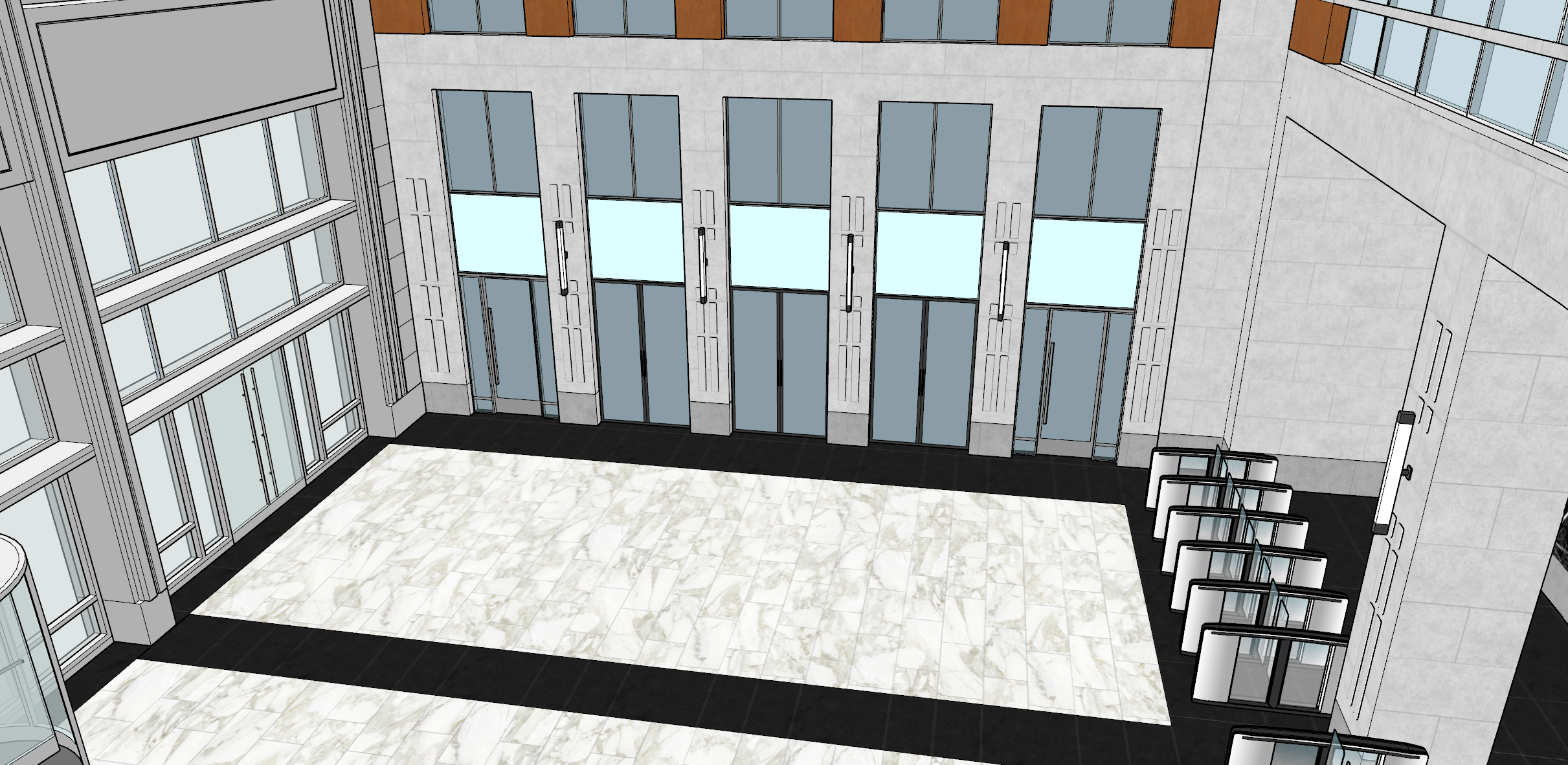 render a top down overview of a grand atrium lobby bathed in natural sunlight coming from the left side storefront glass revealing the pedestrian city sidewalk beyond the flooring showcases a luxurious high contrast pattern of glossy white calacatta marble and black nero marquina tile along the center show three double black framed glass doors on the first floor opened into a modern designer caf with black awnings above each door capture people elegantly flowing in and out between the caf and lobby the caf interior should feel lively yet sophisticated with sleek seating and caf tables extending slightly into the lobby area the lobby furniture is high end and inviting where people sit comfortably chatting or enjoying coffee all interior sconces are lit casting a warm glow that complements the abundant daylight for a balanced upscale atmosphere