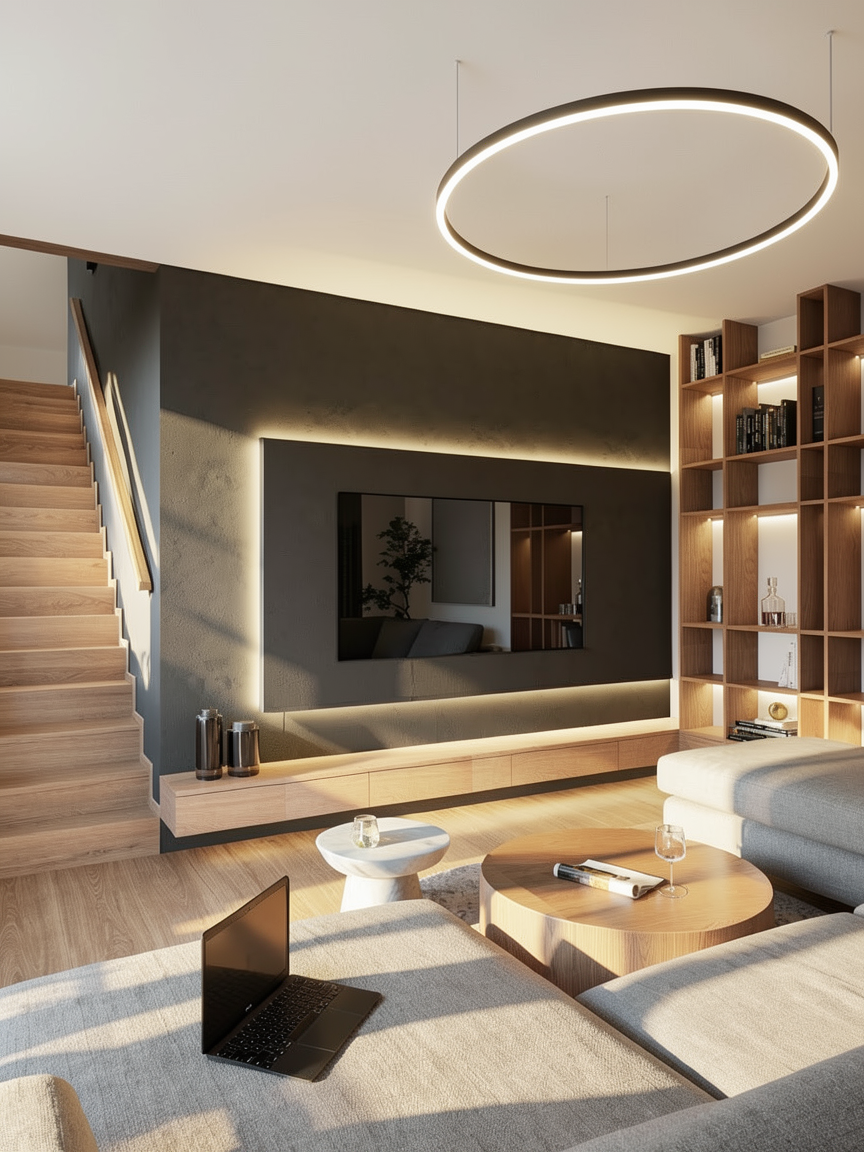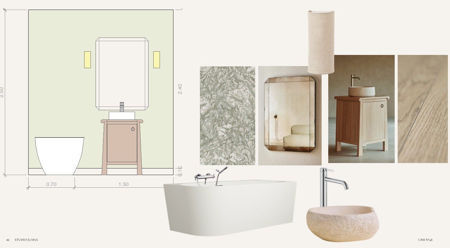 front elevation view of a modern classic bathroom the total width of the frontal wall is 2 20 meters the composition must strictly follow the provided reference images architectural drawings elevation and detailed floor plan reproduce exactly the same bathroom mirror vanity unit and stone washbasin shown in the reference photographs matching the exact dimensions proportions and finishes the vanity is 60 cm wide and must be located on the right side of the bathroom positioned exactly 27 cm from the right wall the layout and placement of all elements must strictly respect the indicated disposition in the plans the bathroom features a beige porcelain tile floor with a 1x1 meter grid layout a white ceiling and all walls finished with the same wallpaper include two wall mounted lights placed symmetrically on both sides of the mirror exactly as shown in the reference image the vanity furniture is made of wood with a stone washbasin and a chrome finished faucet on the left side of the bathroom a freestanding ceramic bathtub must be visible in the frontal elevation view lighting must be warm soft and welcoming no design changes no reinterpretation no added elements no scale alterations maintain high material accuracy and a realistic architectural visualization