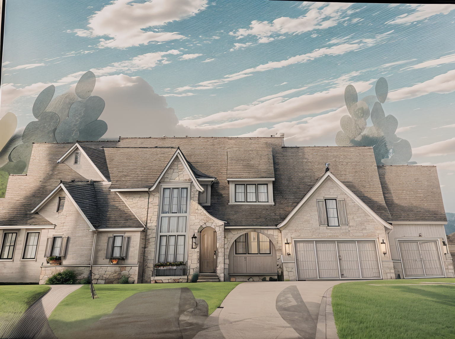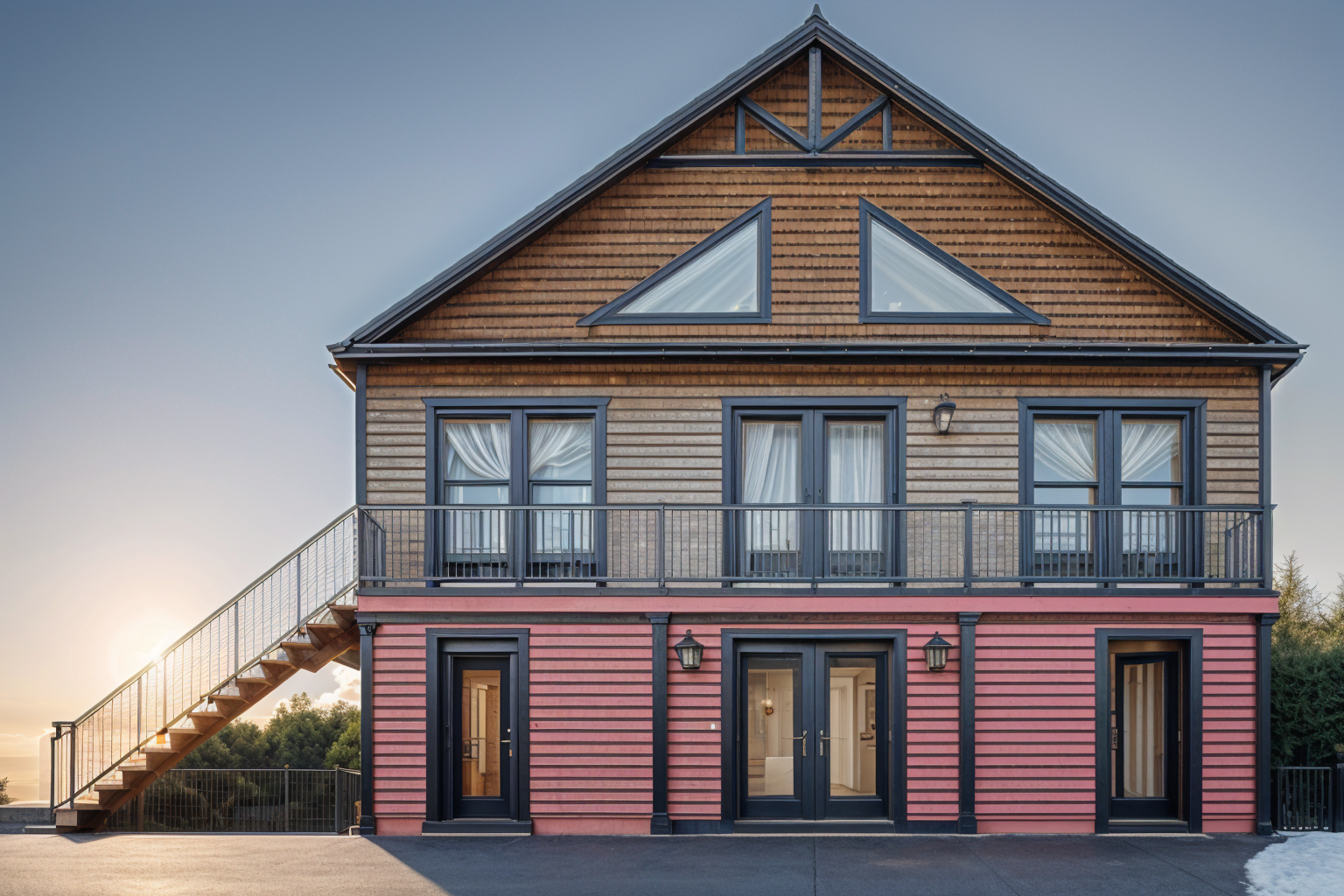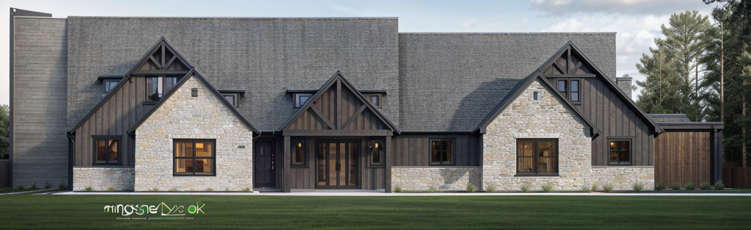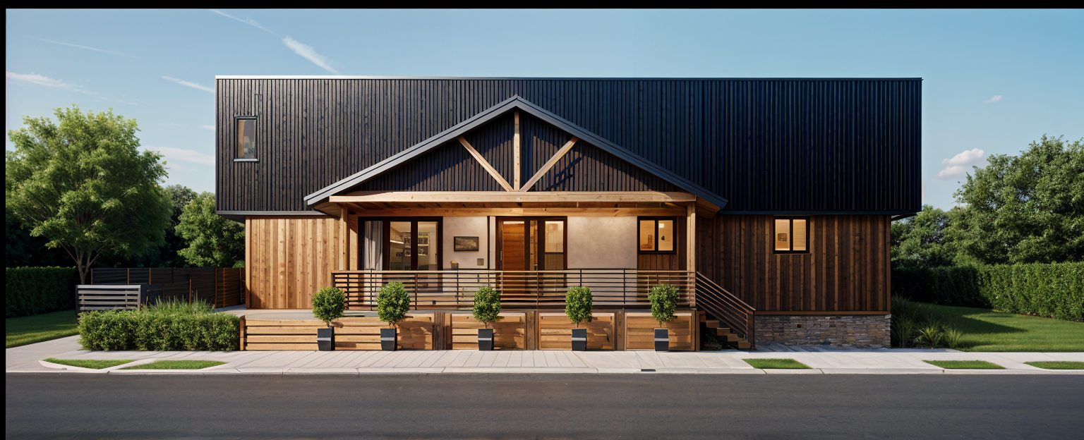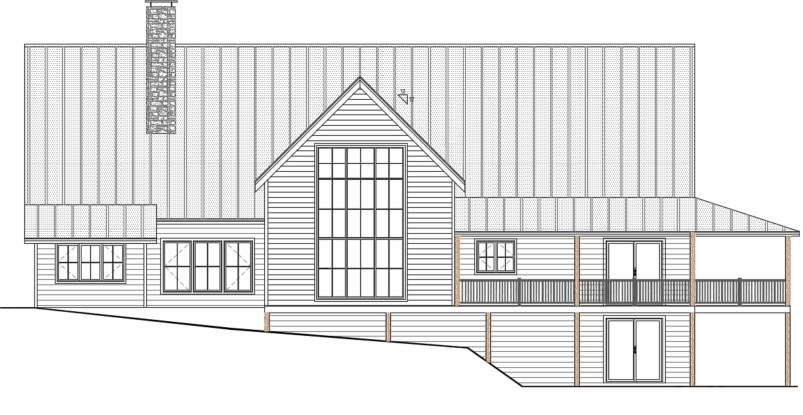 modernist wide angle shot white clapboard siding with black window frames match the grille pattern on drawing stone chimney black metal roofing architecture