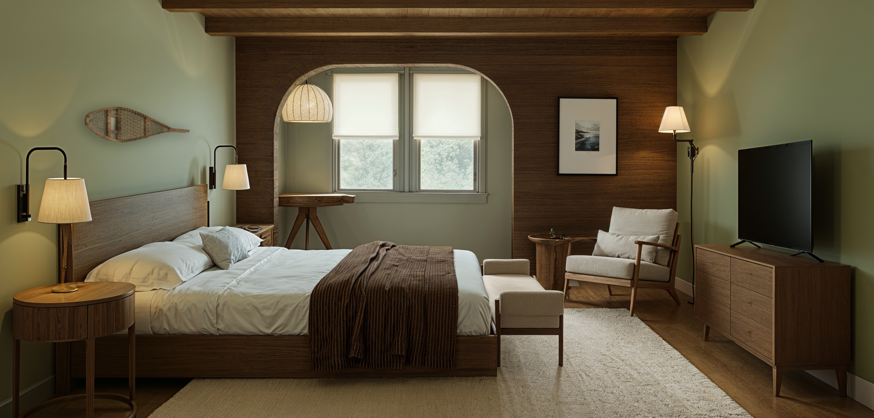 a cozy and inviting bedroom featuring sage green walls and warm wooden furnishings for a natural ambiance the bed has crisp white sheets with a textured brown throw blanket creating a harmonious contrast warm beige lamps cast a soft glow enhancing the serene atmosphere a plush cream rug covers the wooden floor complementing the beige upholstered bench and chair the walls are adorned with minimalistic decor pieces adding to the tranquil minimalist aesthetic soft natural light filters through the windows highlighting the peaceful setting