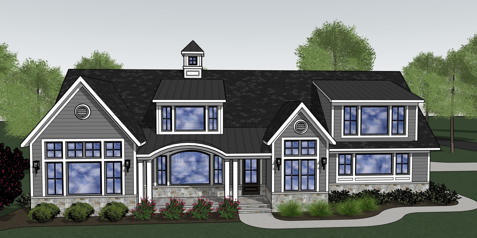 partly cloudy day some deciduous trees behind the house a street and lake erie are in front of the home and the water is reflected in glass windows 2 chairs and a side table on the porch gray siding white trim white windows add landscaping