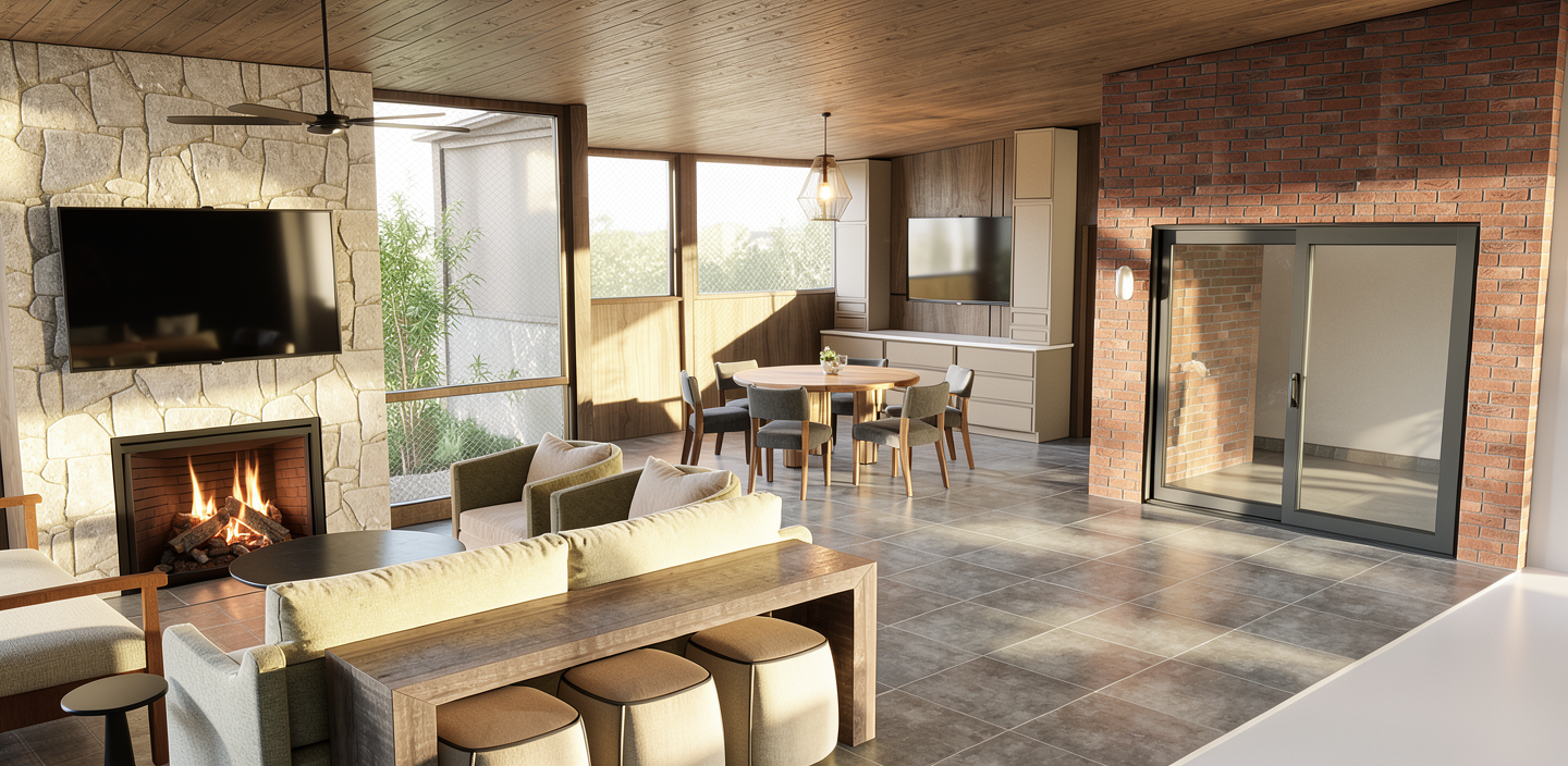 exterior shot create cubes in a black tanned wood design add greenery trees parking and a foyer to the front of the house it is supposed to be an office building for a small company for about 10 people add grass instrad of white surface