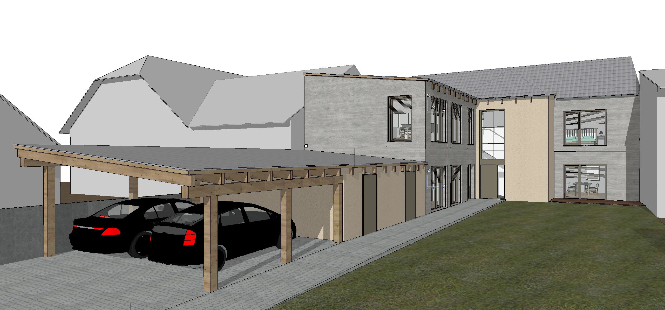 exterior shot render a modern two story house with large windows and a flat beige facade the roof is grey and slanted contrasting with a wooden carport on the left that houses two sleek black cars the driveway is paved with smooth light grey stones leading to a neatly trimmed grassy area the atmosphere is serene and vibrant with sunlight casting soft shadows highlighting the smooth textures of the walls use warm beige and natural wood tones for the building elements and incorporate realistic greenery to enhance the inviting and contemporary aesthetic