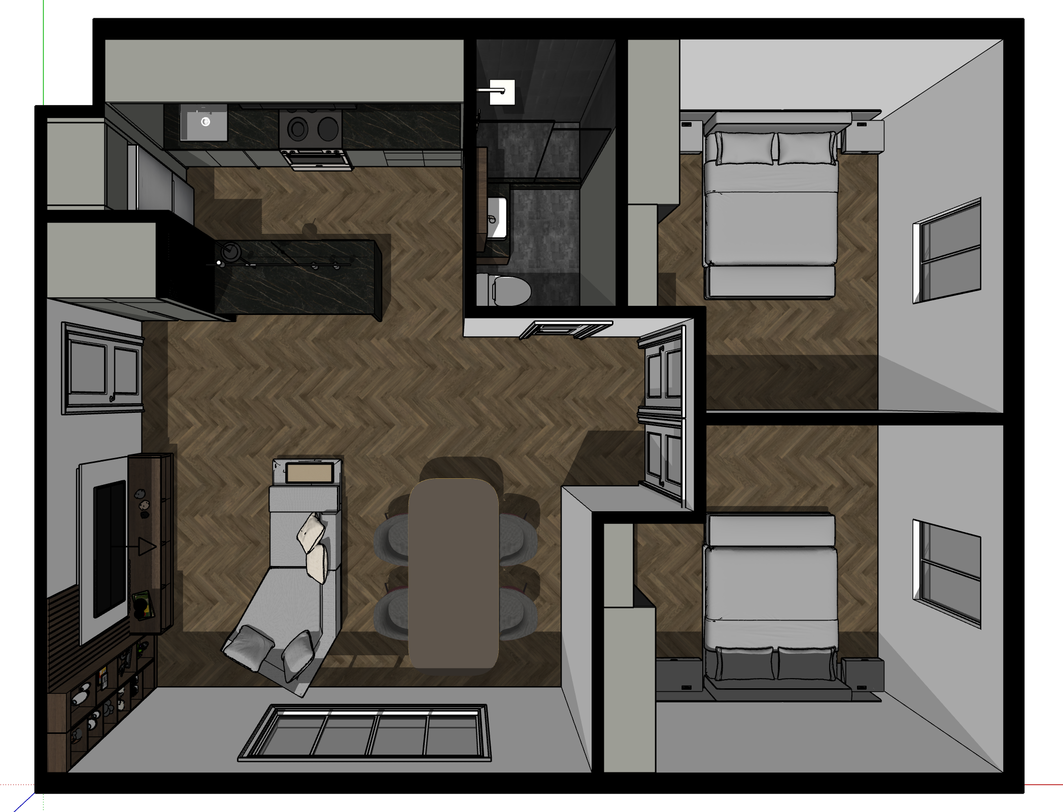 create a beautifully rendered top down view of a modern apartment layout use warm earth tones for the wooden herringbone floors to create a cozy atmosphere incorporate dark marble countertops in the kitchen for a sleek elegant look use soft white tones for the walls to give a neutral yet sophisticated backdrop add a modern dining table in light brown with chic gray chairs feature a comfortable sofa in a soft light gray with contrasting white and dark gray throw pillows the kitchen and living area should have ample natural light to enhance the welcoming vibe
