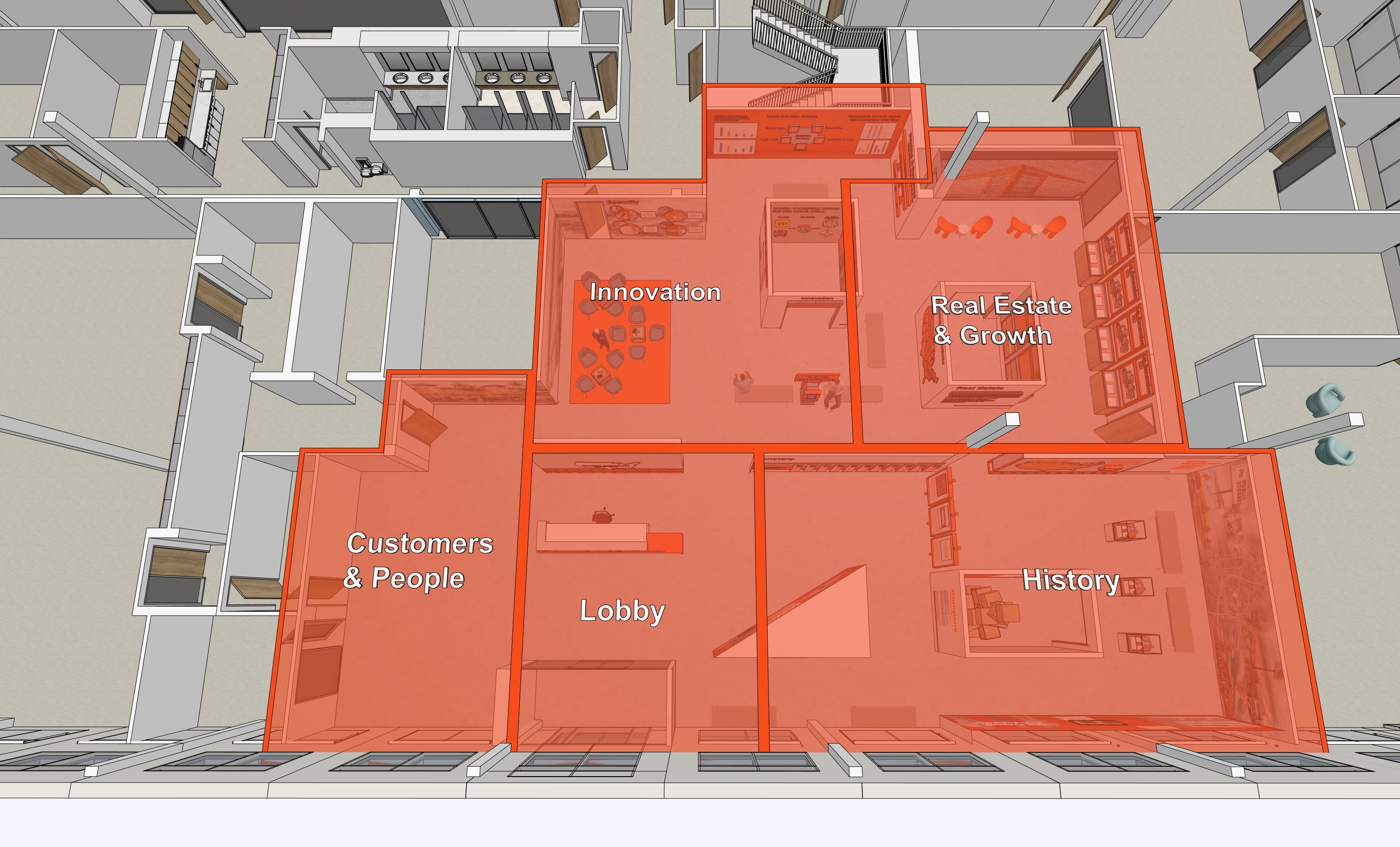 photorealistic interior top down view of floorplan with orange overlay color polished concrete floors white walls and light metal orange finishes the space is lit up with soft soft lights bright lighting and overall environment is soft bright lighting