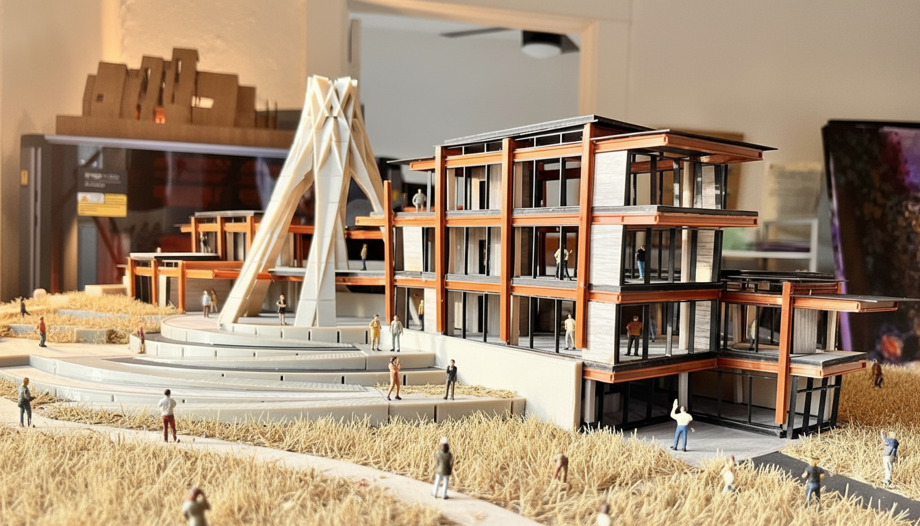 set the building in beige grass people standing on the balconies in the windows and around it make the people smaller