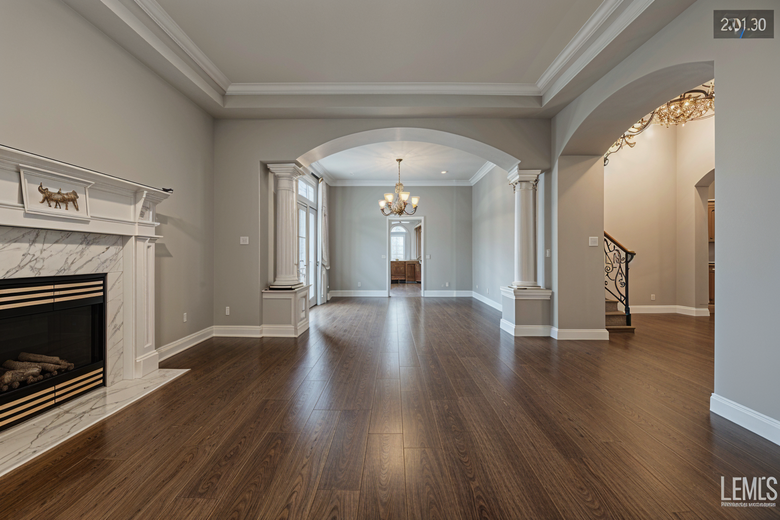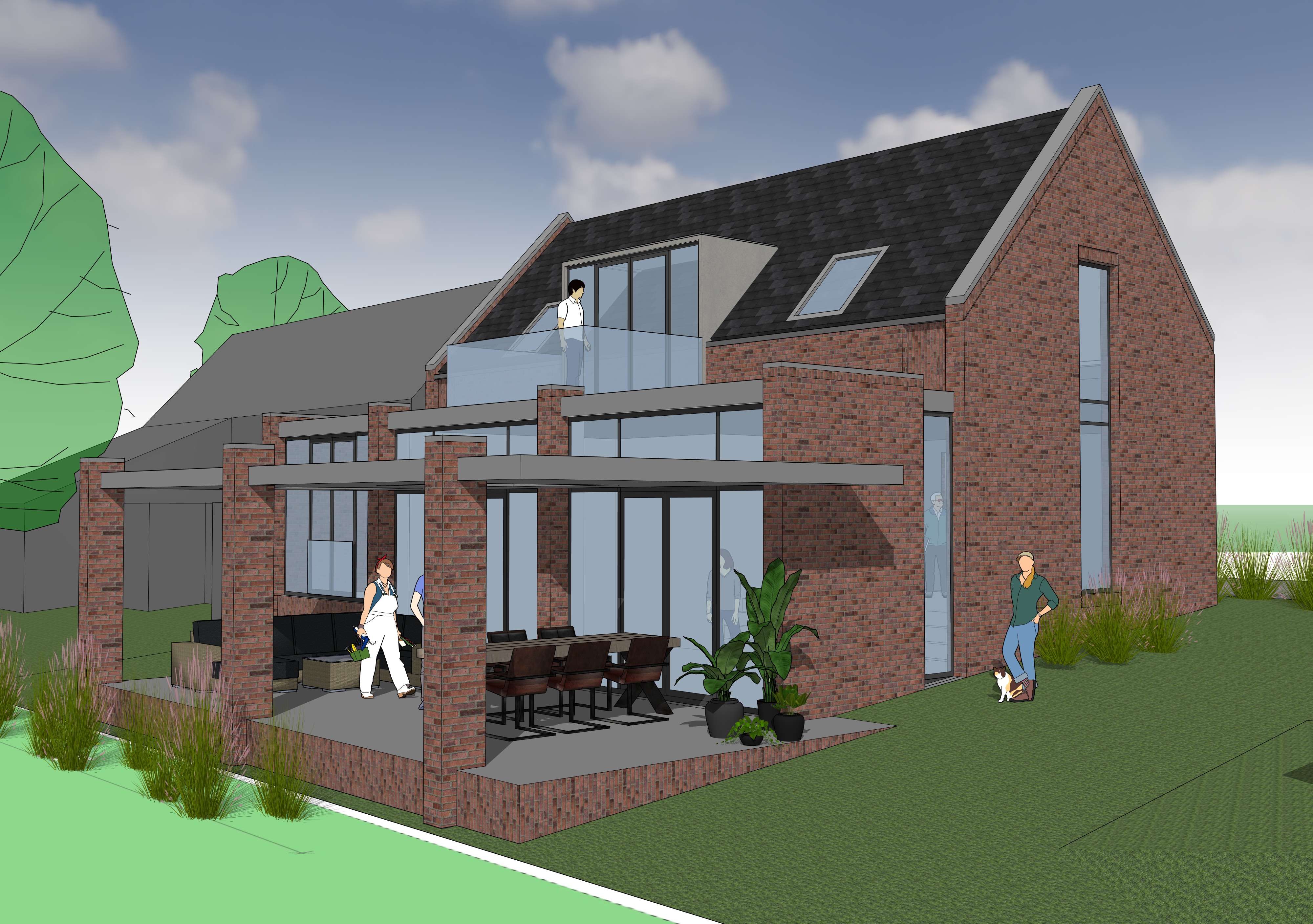 a modern suburban scene featuring a gable roofed brick house with large vertical windows the house is made of textured red bricks with a dark gray roof and light blue tinted windows reflecting soft daylight surrounding the house are neatly maintained plants and shrubbery colored in lush green with hints of natural brown earth the pathway is a smooth gray concrete leading up to the house and bordered by grass the sky is a gradient of soft blue with scattered fluffy white clouds creating a calm serene atmosphere additional greenery includes tall stylized trees with vibrant green leaves and subtle shadows cast by the sunlight the overall atmosphere is peaceful and inviting reminiscent of a fresh spring morning