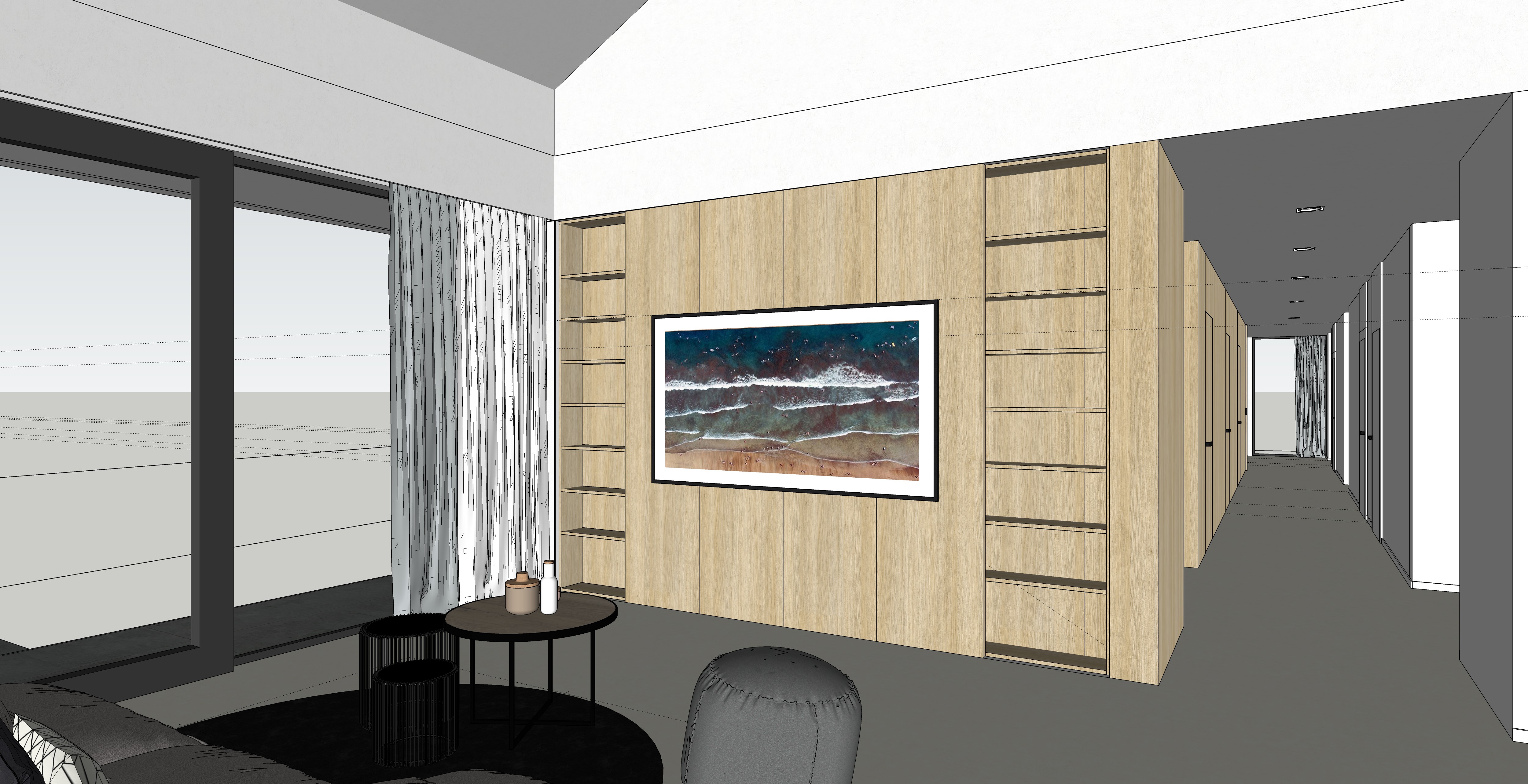 photorealistic interior soft light through the windows and curtains on the left side light wood shade books and decorative objects on the shelves shelves backlit a garden with grass is visible through the window white semi matt floor