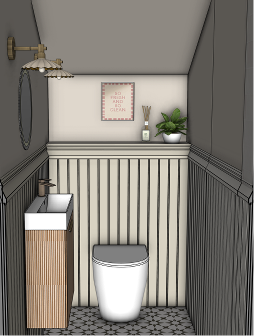 natural lighting for this small but perfect en suite bathroom for a teen girl walls and ceiling are in a warm cream with half height tongue and groove panelling in a mid toned cream taupe all hardware is a brushed brass with the light shades being a mid taupe matte metal black and off white patterned floor tiles add some interest to the space with a cream small rug with a black scalloped edge photo realistic and high quality for interior design clients