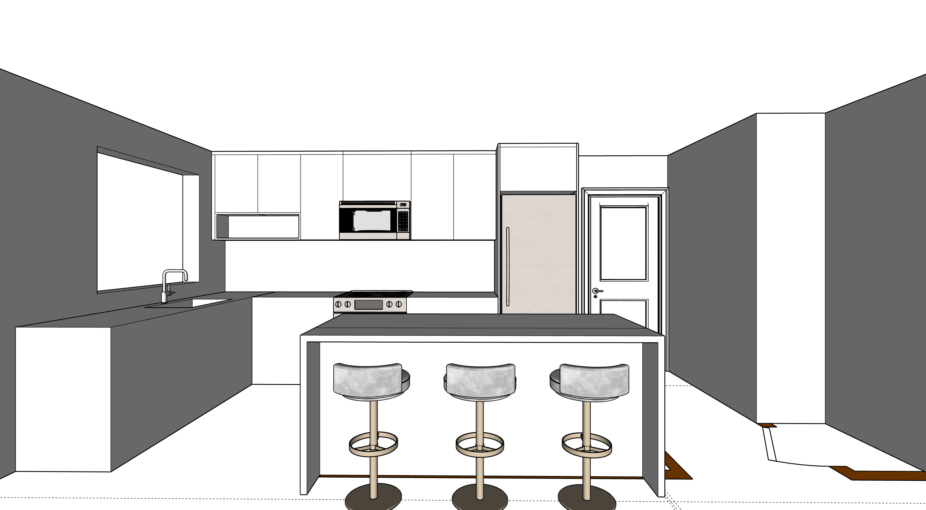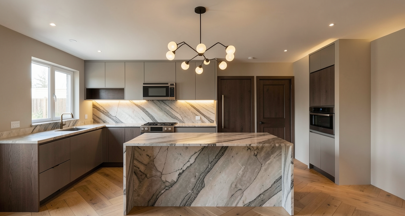 overall aesthetic warm contemporary minimalism everything is texture and proportion cabinetry base cabinet flat front handle less doors throughout dark brown shinoki oak upper cabinet warm taupe greige tone not grey not brown somewhere between open shelf at the left of the stove has the wood colour same as the base cabinet stone countertop dramatic bookmatched or large format slab grey cream marble with heavy movement island has a waterfall edge with thick profile same stone used for backsplash on the stove wall sink side does not have stone backsplash flooring wide plank herringbone hardwood warm honey light oak tone matte finish medium width planks fixtures square angular matte bronze or gunmetal faucet minimal spout 90 geometry appliance is stainless steel lighting sculptural pendant branching arm in dark bronze black with opal globe shades in varying sizes artistic not symmetrical subtle under cabinet or recessed puck lighting on perimeter wall warm glow on backsplash color palette for rendering cabinetry warm greige ncs s 5010 y50r or benjamin moore rockport gray range floor warm light oak metal dark bronze antique brass matte