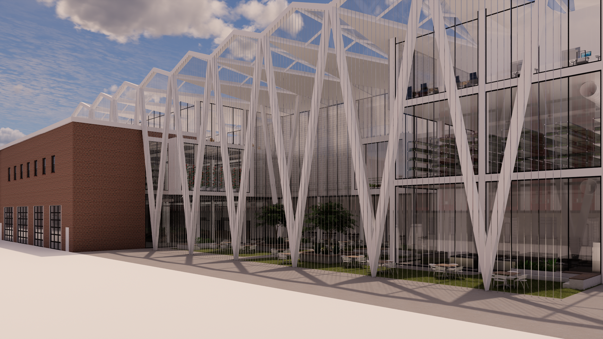 add dense straight green vines climbing only on the vertical cable lines vines must follow each cable from the ground all the way to the top structure with even spacing and equal density do not place vines on the brick building or the glass surfaces preserve the building geometry and 2 point perspective exactly without distortion