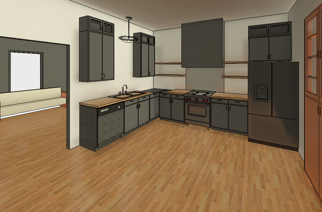 make the cabinets shaker style in a dark gray color make the countertops butcherblock make the walls and ceiling iron ore by sherwin williams make the facuet and cabinet pulls modern black make the backsplash a white quartz seamless