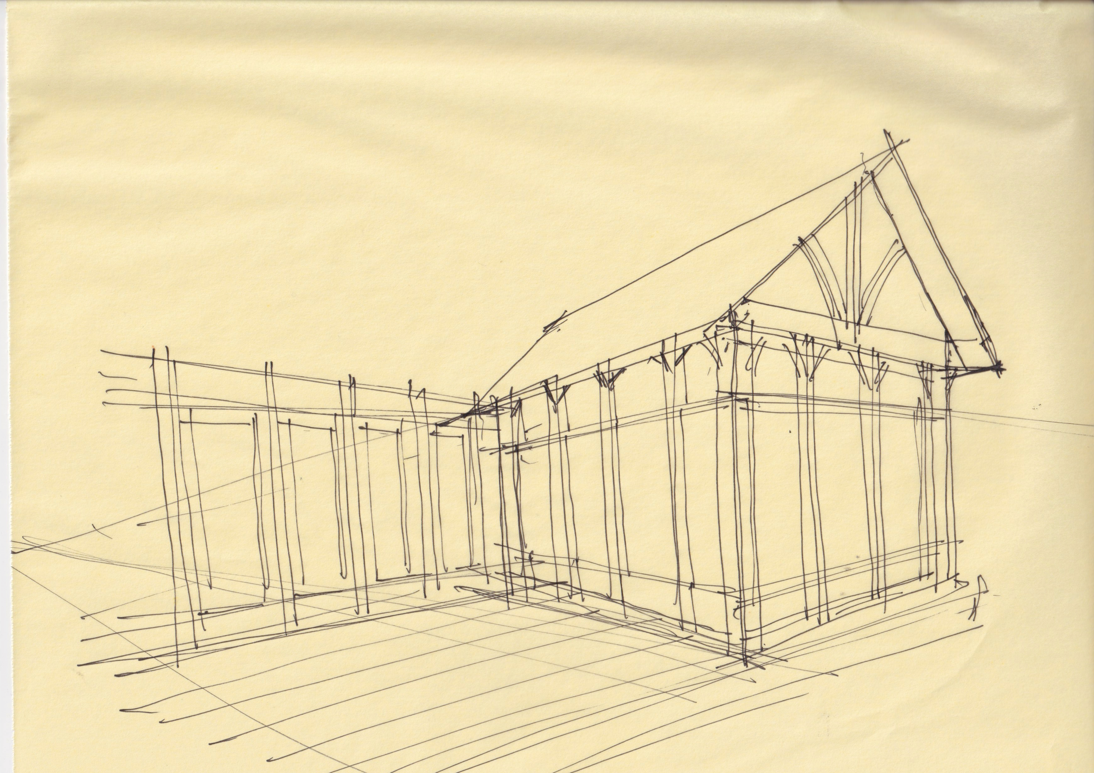 exterior shot brick warm orange and red gray roof wood trellis screen porch rafters swimming pool foreground one story house