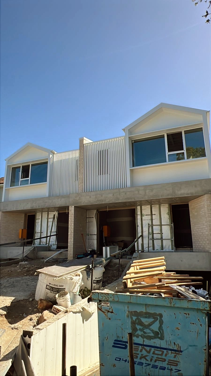change the front yard to have lush green landscaping and sandstone steppers up to the front door have spillover hanging plants on top of the concrete banding vertical timber cladding by to ground floor external wall keep upper floor cladding white no plants on the roof timber framed windows to ground floor