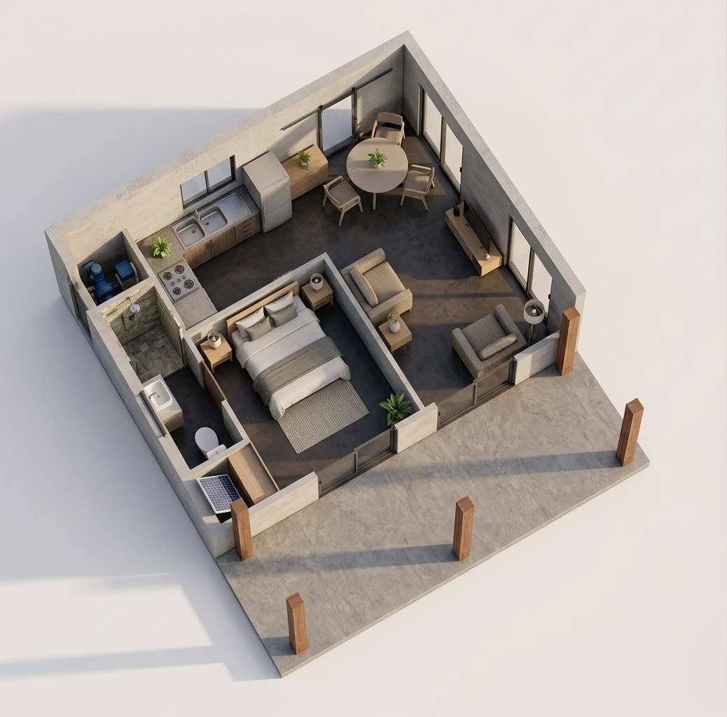 convert this floor plan into a realistic isometric 3d view of a full house show the space from an elevated angle with furniture walls and details visible sostituisci pavimento in marmo con parquet senza alterare gli oggetti use the same furniture as shows on the plan do not change the orientation of the floorplan