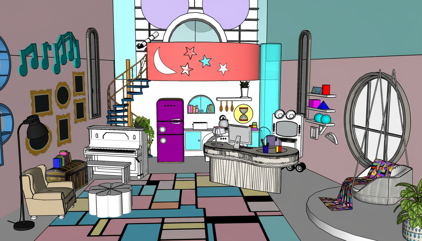 winter with snow neutral lighting daylight light white rough plaster light color spruce timber light concrete block chimney bushes behind a metal fence in the front