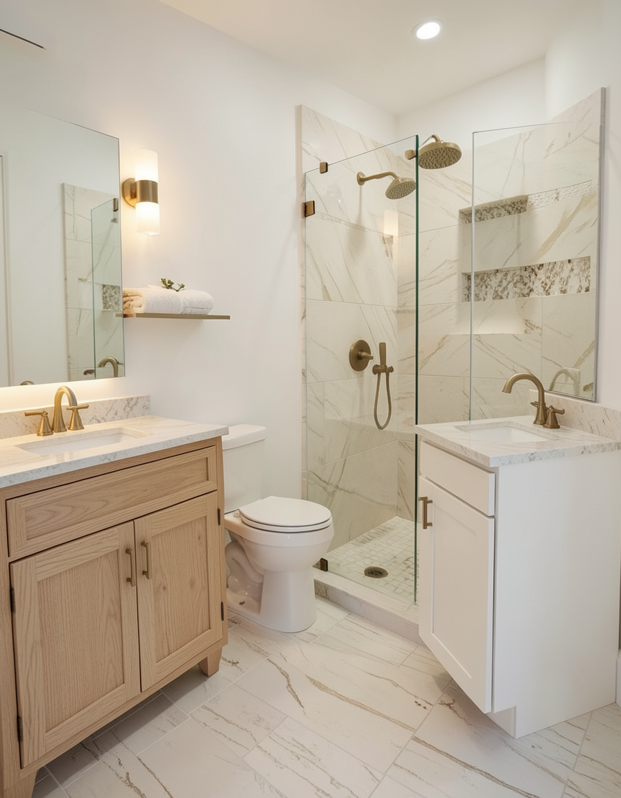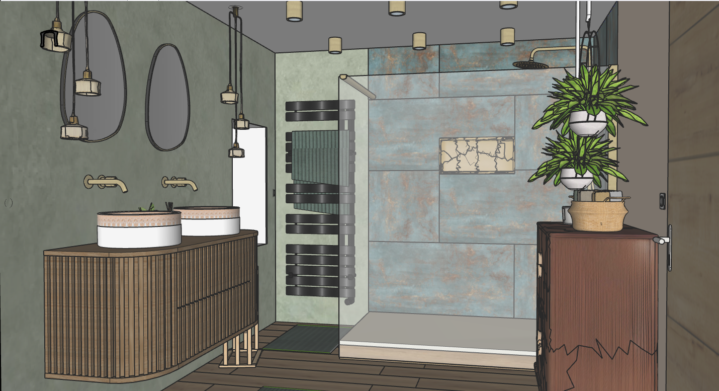 bathroom with a 180 cm shower tray sage green wall walnut colored cabinet