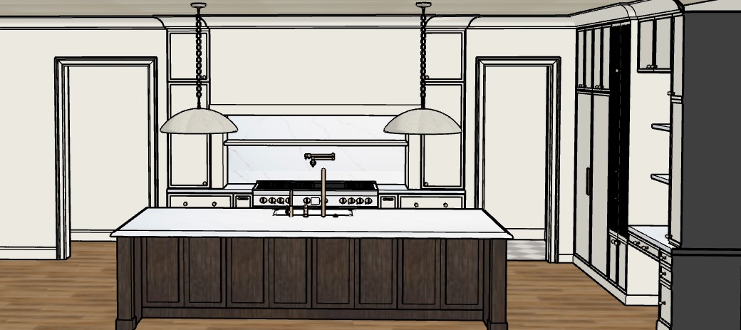 a beautifully rendered modern kitchen with a sophisticated atmosphere the central island features a dark walnut wood finish with a polished white marble countertop pendant lights hang above the island casting a warm soft glow and are crafted from brushed nickel the walls are painted in a clean soft ivory complementing the rich oak hardwood floor cabinets and shelving are sleek and contemporary with a subtle cream hue the stove area includes a backsplash of elegant white marble adding a touch of luxury the overall lighting is bright yet gentle creating an inviting and serene ambiance