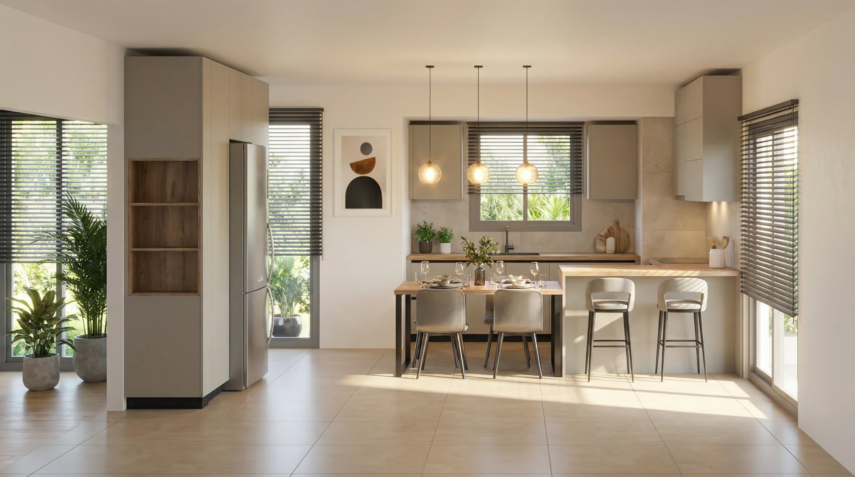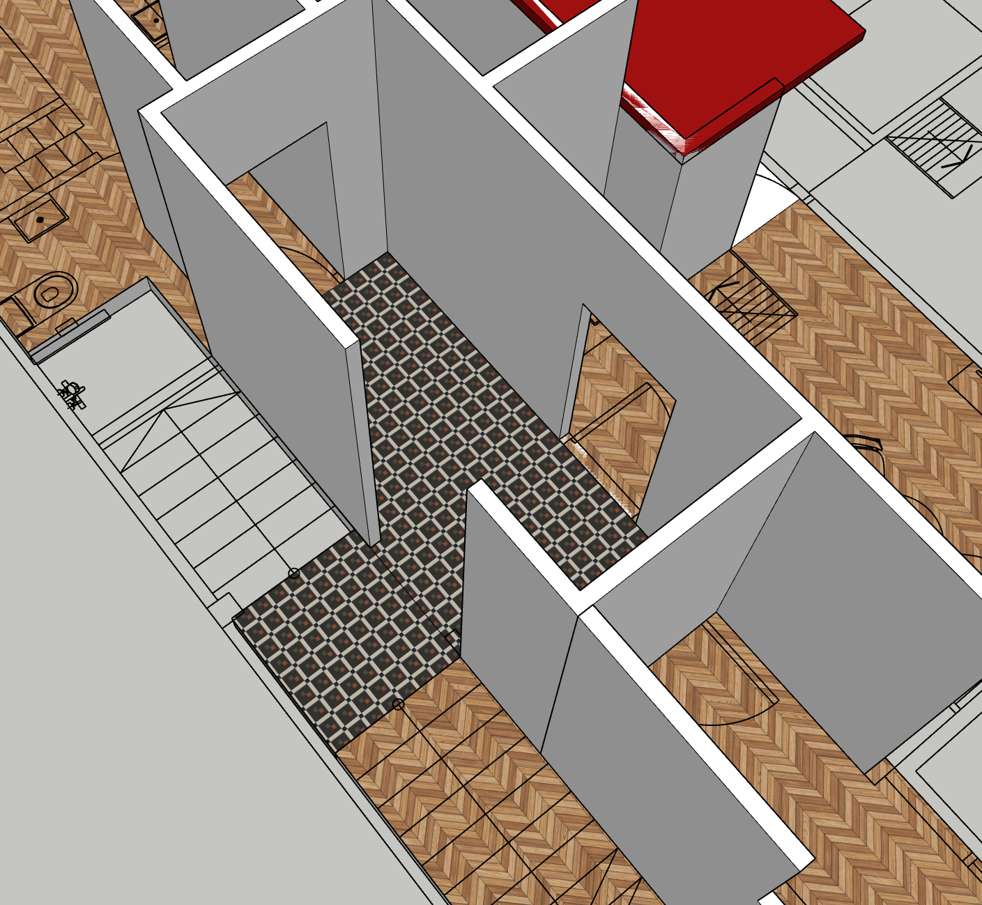 can you convert this to a isometric plan view the flooring pattern will be mosaics can you render the pattern exactly as how it is and the brown flooring is timber flooring herringbone pattern for the walls can you do a half height timber clad and above it off white limewash paint
