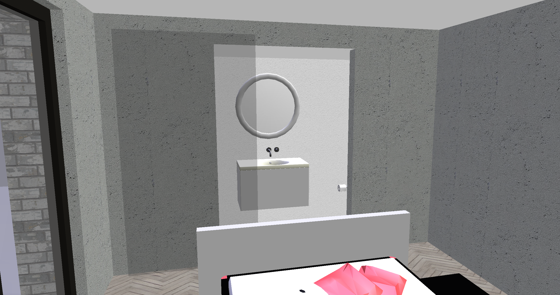 genau dieses rendering berarbeiten fotorealistisches innenraum foto exakt dieselbe perspektive und kameraposition wie das hochgeladene referenzbild 100 identische raumgeometrie exakt gleiche m belanordnung exakt gleiche verlegeart und richtung von parket und platten wie vorlage parket ruhig und hellgrau weiches nat rliches tageslicht raum k nstlich ausleuchten sanfte realistische schatten realistische materialien stoff mit leichten gebrauchsspuren hochwertige oberfl chenreflexionen lavabo komplett aus marmor collemandina grigio in braungrau dunkel lavabo innen ebenfalls collemandina im unterbau im obersten drittel eine griffmulde ber die ganze breite ganzer unterbau in collemandina unterbaum bel mit unterbaubeleuchtung dahinter eine gessi wandarmatur edelstahl vollkommen rahmenloser und hinterleuchteter spiegel mit echten spiegelungen alle sichtbaren w nde sind sichtbeton schwarze steckdose rechts vom lavabo auf gleicher h he wie die armaturen schwarze runde deckenspots im bad und im zimmer bett wie vorlage modern mit kopfteil aus beigem abgestepptem stoffbezug mittig im raum parket im zimmer ruhig und hellgrau boden im badbereich collemandina grigio in braungrau links vor der wand zum bad ein grau get ntes durchscheinendes glas zum schieben an filigranen rollen aus edelstahl oben ber die ganze breite aufgeh ngt gr sse die dunklere fl che in der vorlage fassade aussen aus hellgrauem klinker sehr moderner minimalistischer look nat rliche farbwiedergabe golden hour feeling hell ausleuchten das bild muss wie eine professionelle fotografie aussehen es soll ein echtes und reales foto sein canon eos r5 35 mm festbrennweite f 2 8 hyperrealistisch dslr qualit t raw aufnahme 8k aufl sung extrem scharf perfekte tiefensch rfe professionelle architekturfotografie