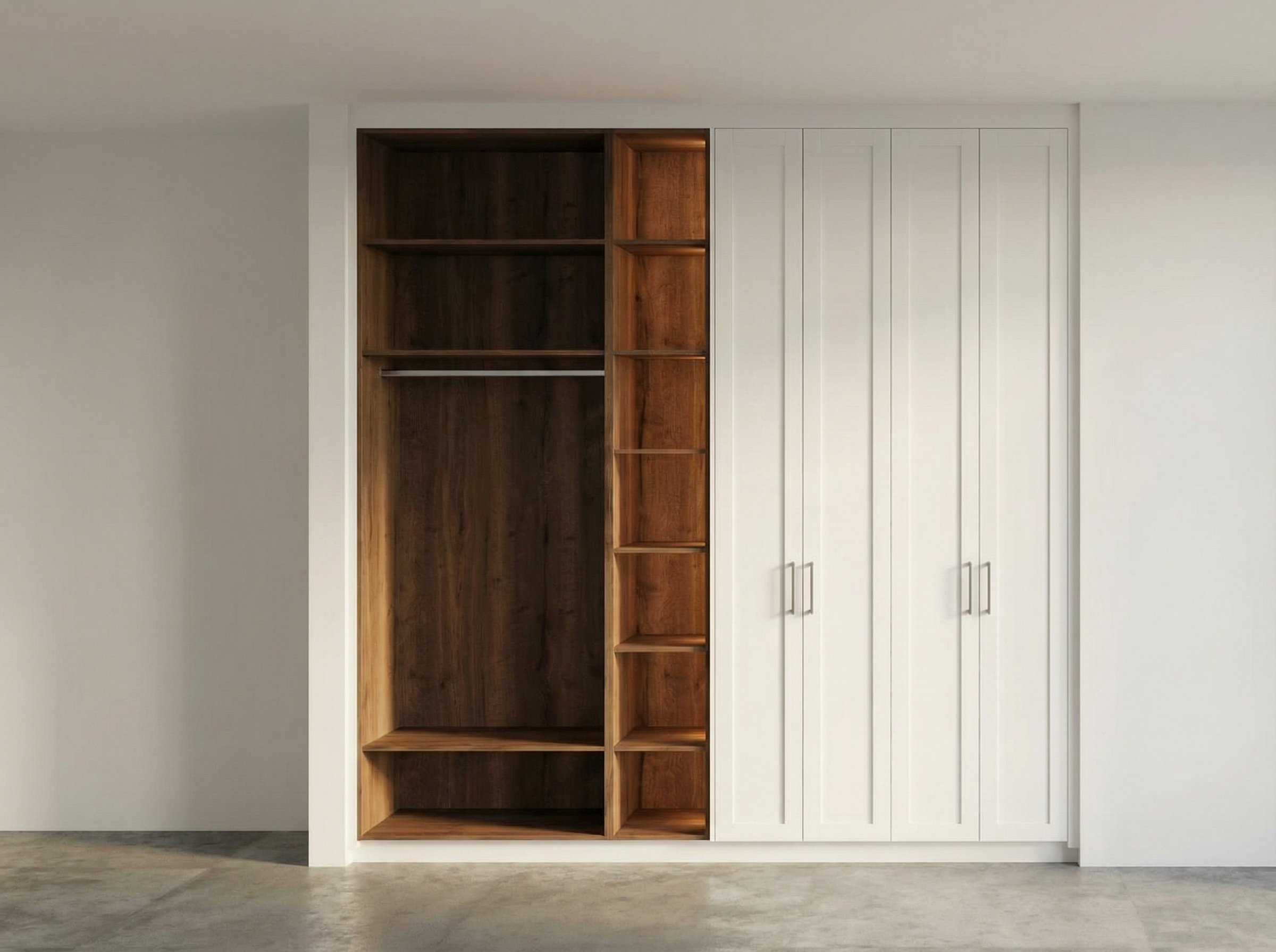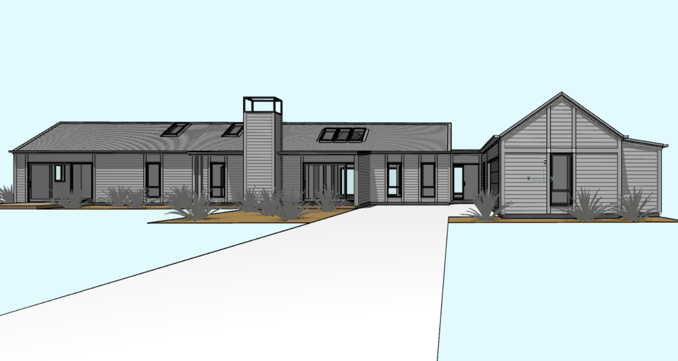 black metal roof grey shiplap cladding black window frames extensive native planting lawns sunset interior lights on