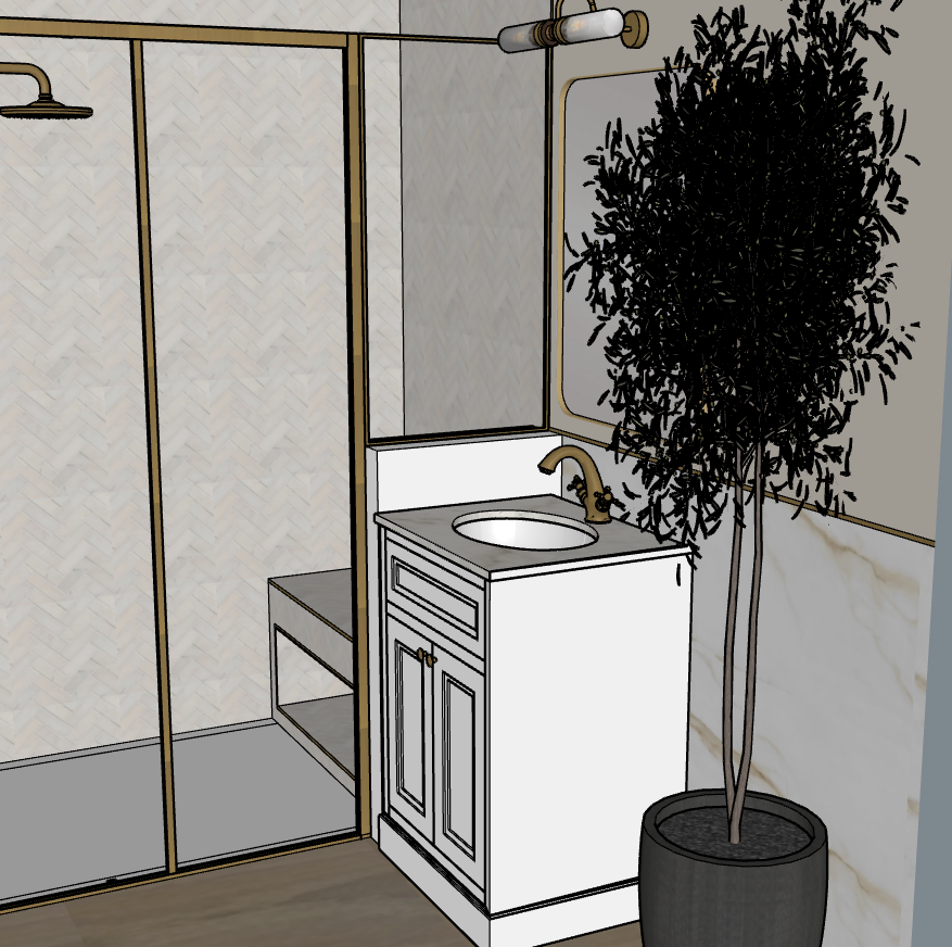 led mirror above vanity with led in niche in shower and flush ceiling spot lighting above shower