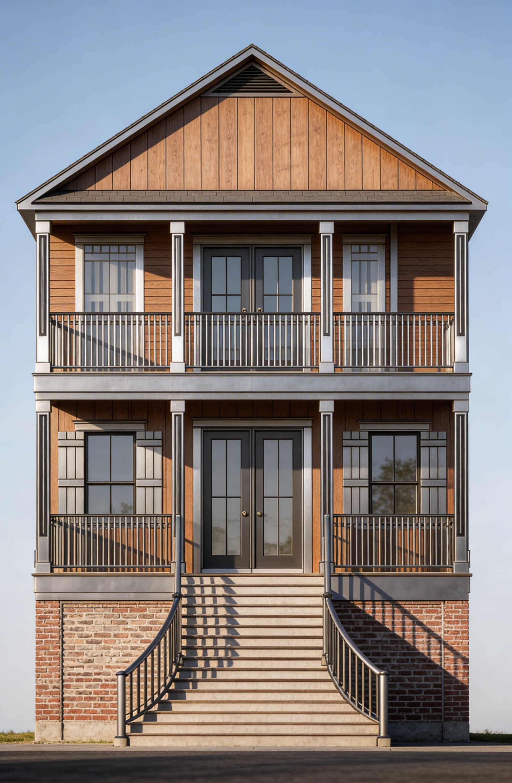 create a modern facade for an art school without changing the shape with wooden elements in the middle with glass without landscape