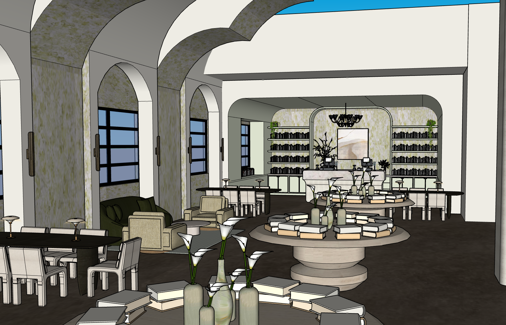 add people and ceiling white walls are sherwin williams greek ville and keep the arches and behind the desk the wallpaper