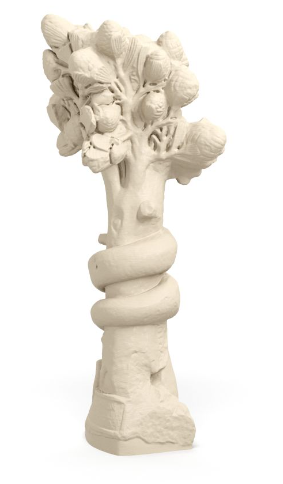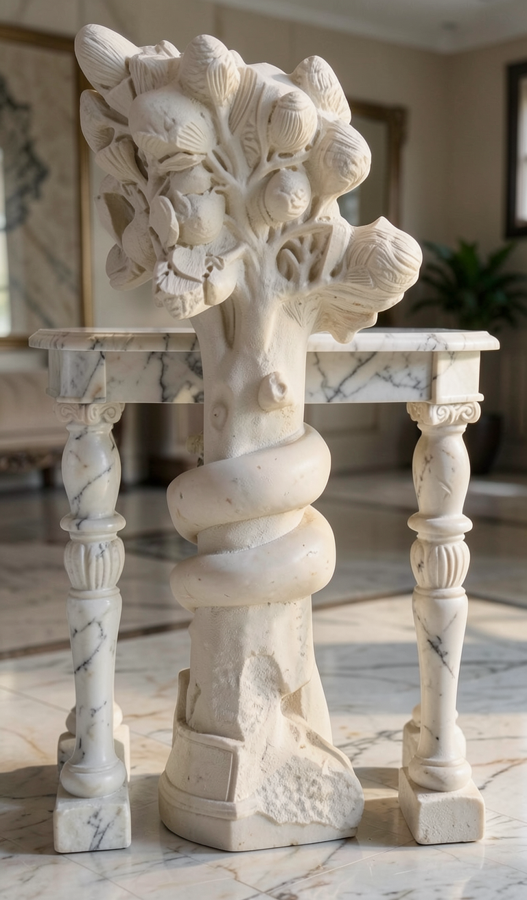 photorealistic marble dining table with a thick white carrara marble tabletop polished supported by four identical sculptural marble legs matching the reference sculpture organic trunk clustered faces flowers at the top a snake coiled around the middle rough stone base the sculptures are used as the table supports at each corner clean studio background soft diffused lighting high detail sharp focus luxury design realistic shadows 3 4 perspective