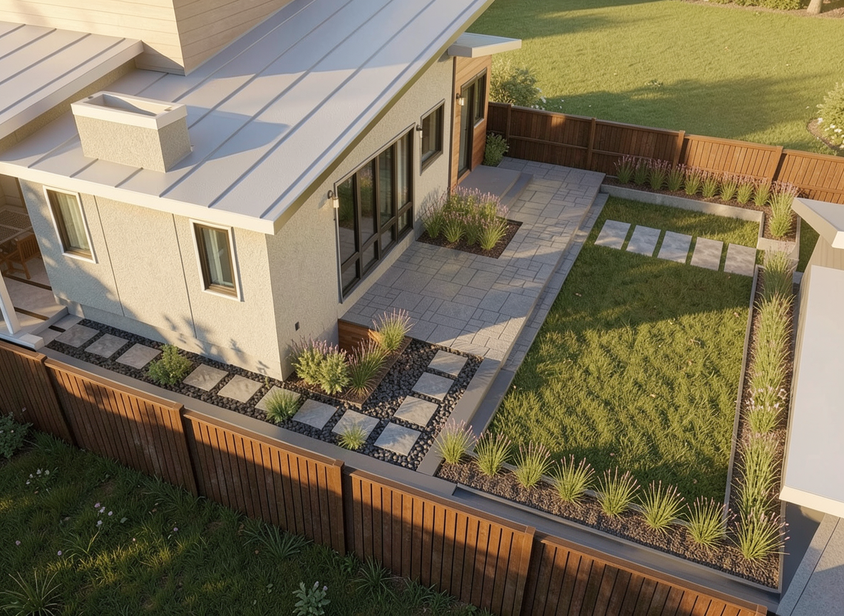 red corrugated metal barn detailed and vibrant open door revealing bright interior with exposed structure lush greenery around sunlit atmosphere with soft shadows blue sky overhead colors barn deep red interior bright white floor charcoal gray greenery rich green sky light blue show the garage door open fill the soffit area in with dark soffit and fascia trim