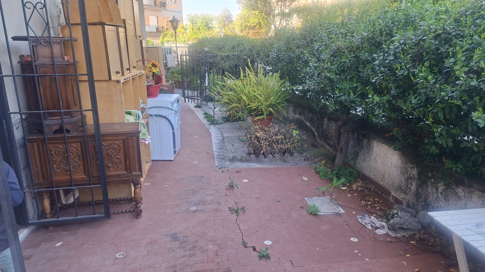 remove all the forniture and pave with beige porcelain stoneware tidy un the greenery remove table chairs i want to see only floor