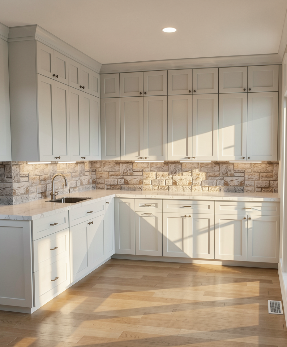 two storey mediterranean residential house with light grey exterior walls in vitex mostic fog color and brown clay tile roofs the house has multiple roof volumes and mediterranean architectural details the ground floor includes a large covered veranda supported by columns the veranda has vertical wooden railings and iroko wood decking painted light grey a central staircase leads to the veranda the first two steps are wide kavala natural stone slabs forming a shallow landing that blends naturally with the surrounding terrain a central pathway made of irregular kavala stone slabs leads from the entrance of the plot to the staircase of the house on both sides of the central pathway there are parking areas made with permeable concrete pavers arranged in long parallel strips with grass growing between them forming an eco friendly parking surface the surrounding landscape includes simple lawn areas and minimal mediterranean garden planting the upper floor has balconies with arches and mediterranean style openings realistic materials natural daylight architectural visualization mediterranean residential architecture green vintage color to the railings