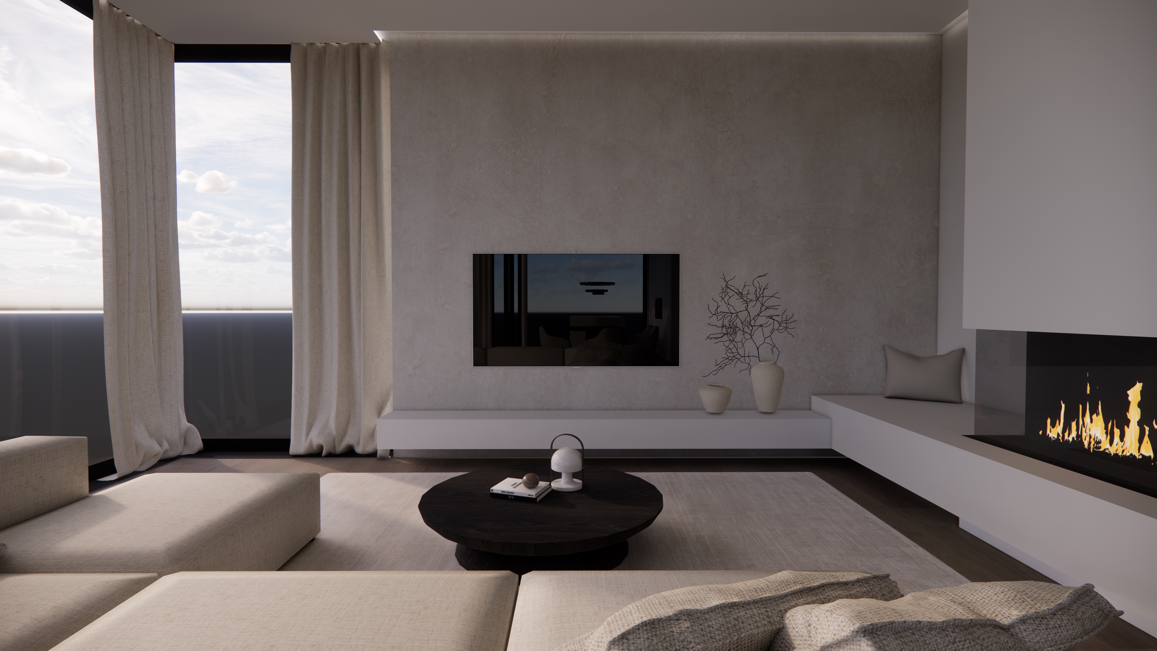 create a photo realistic image make it look more realistic and natural leave the design exactly as it is this is a living room with a tv screen on the wall
