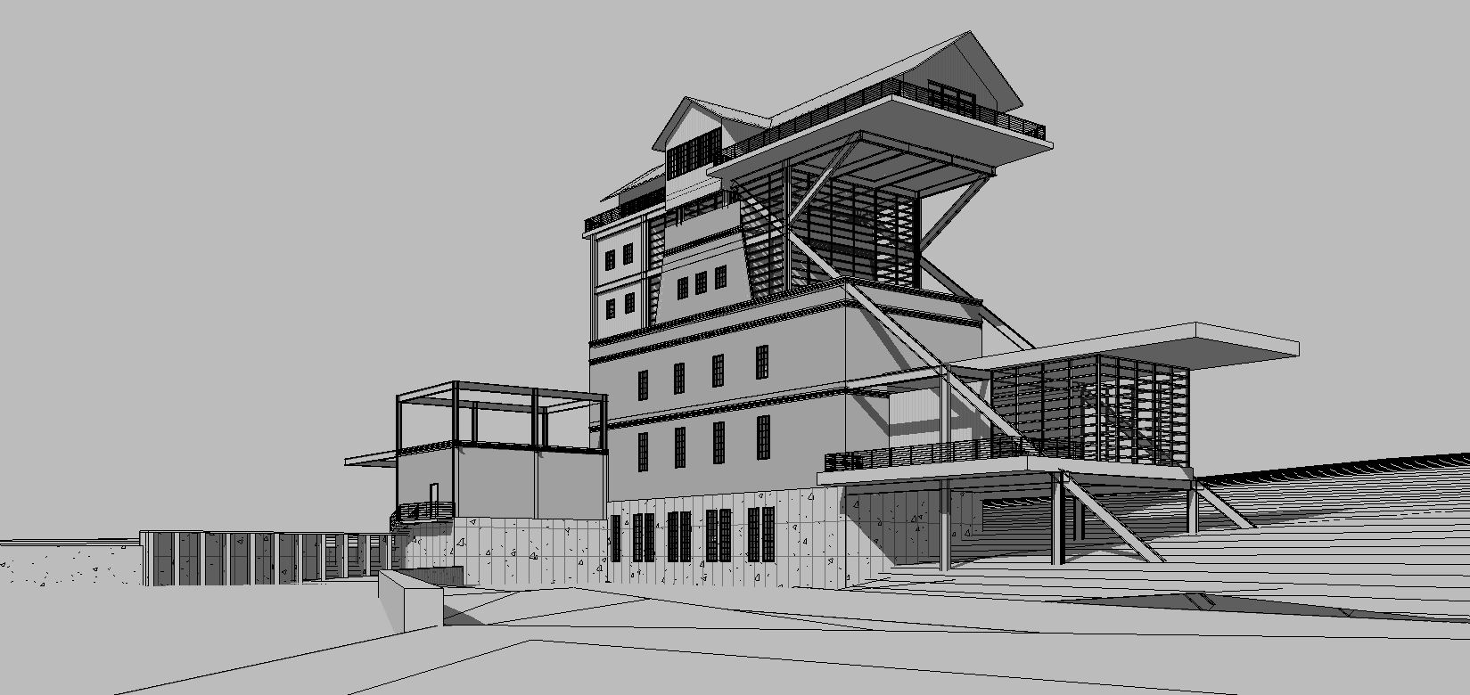 dark vertical wood shiplap siding on condo units with large glass windows brick existing building concrete panel foundation river with dam foreground trees in background dusk sun on building face soft interior lighting