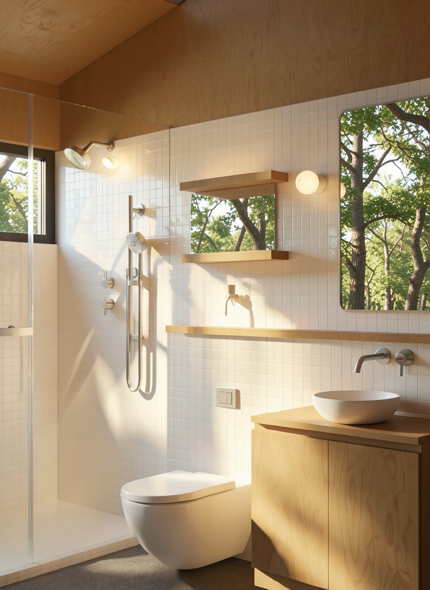 improve realism sunny warm summer lighting no bloom turn on sconces fill grey material to mirror above sink and walls and ceiling in subtle texture wood keep all design materials colors and composition unchanged