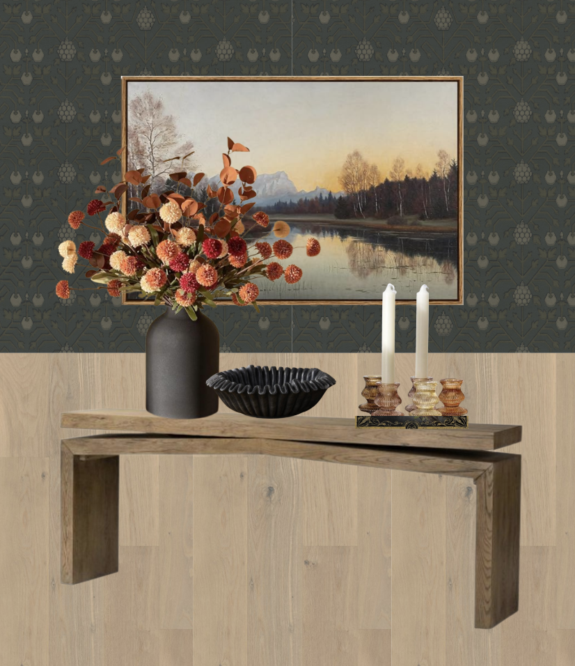 render this image as a sideboard in a dining room the view will be a close up of the console with a corner of the table visible the floor is a lighter oak with a green patterned wallpaper the table has a vase with flowers a ripple black bowl candle sticks on top of a book